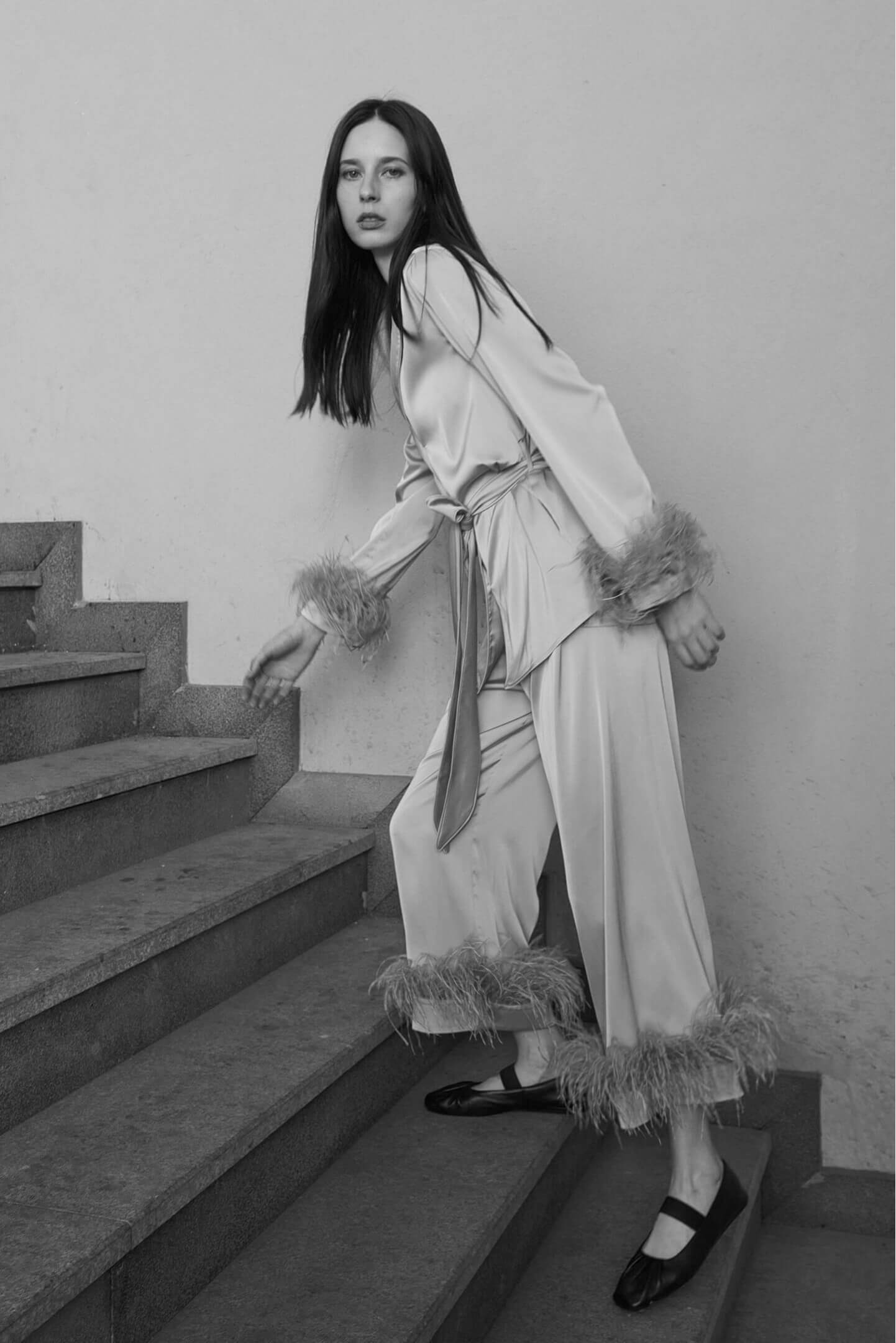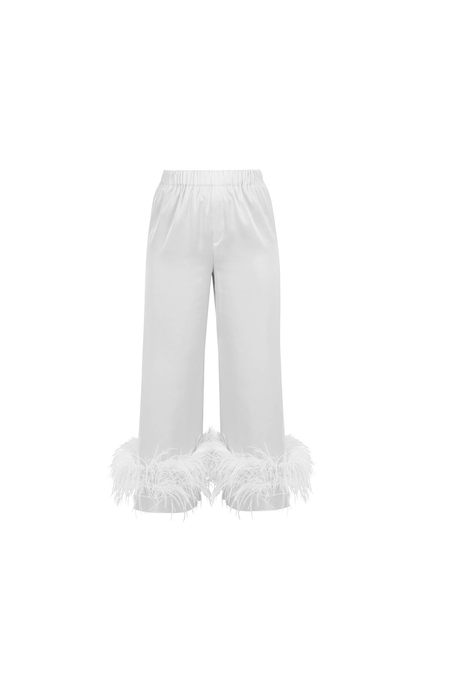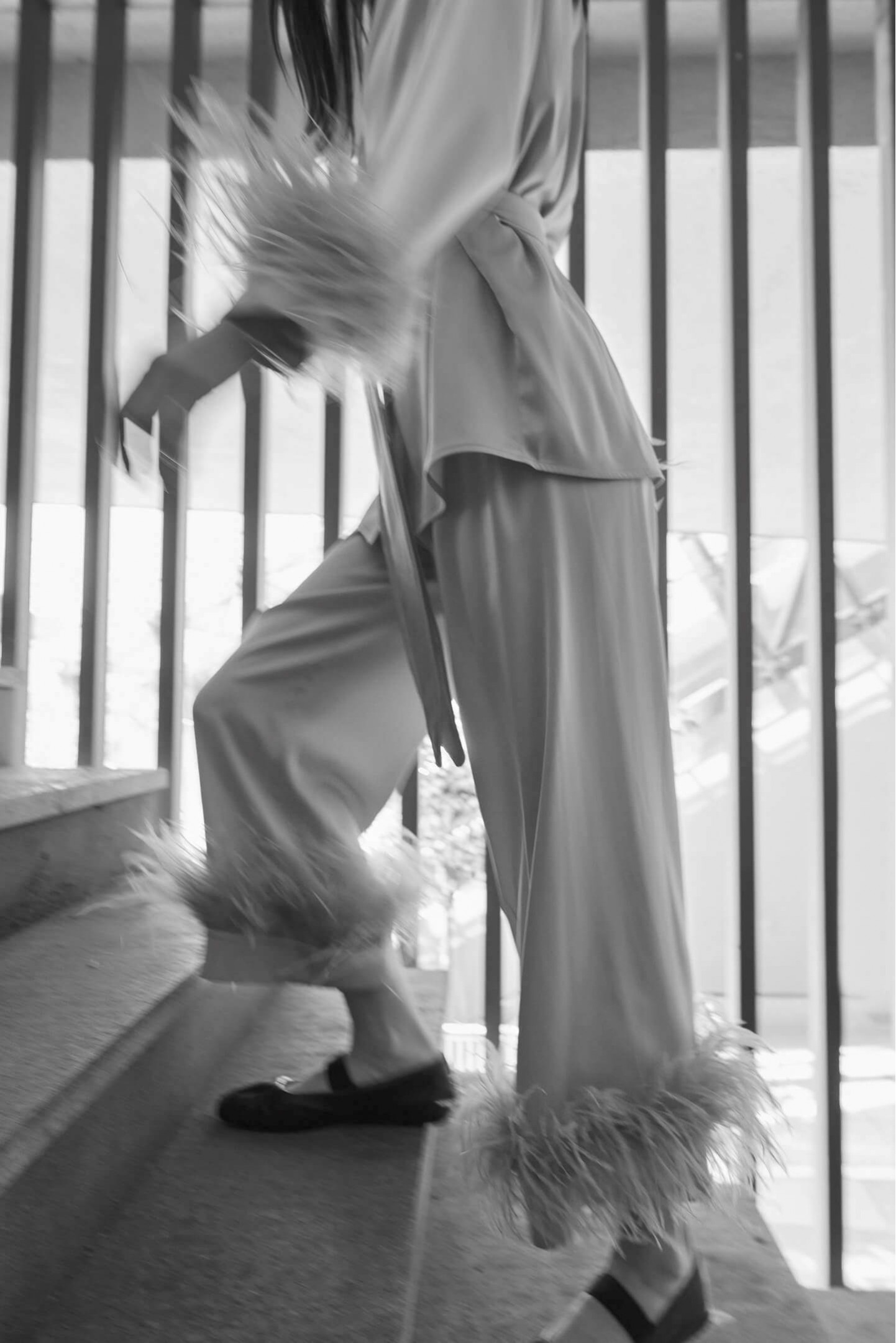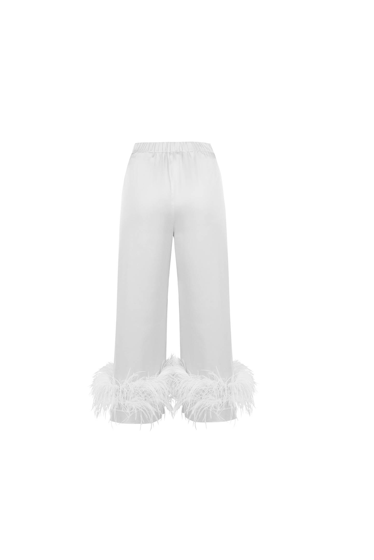 A striking blend of fluidity and flair, the Ostrich Feather Silk Pants offer effortless luxury with a dramatic twist. Crafted from smooth, flowing silk, these straight-leg pants are finished with ethically sourced ostrich feather trim at the hem — adding soft volume and bold movement with every step.