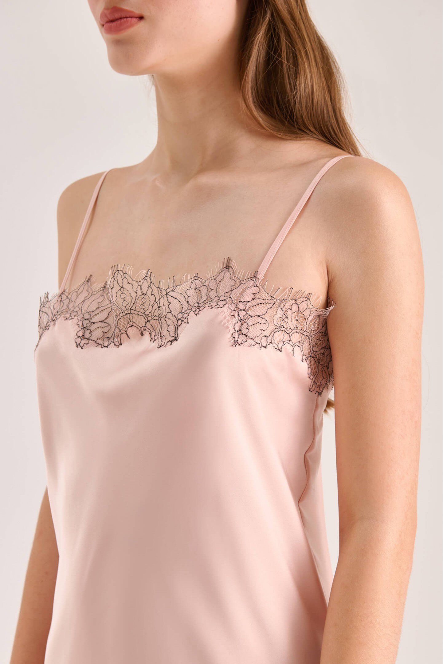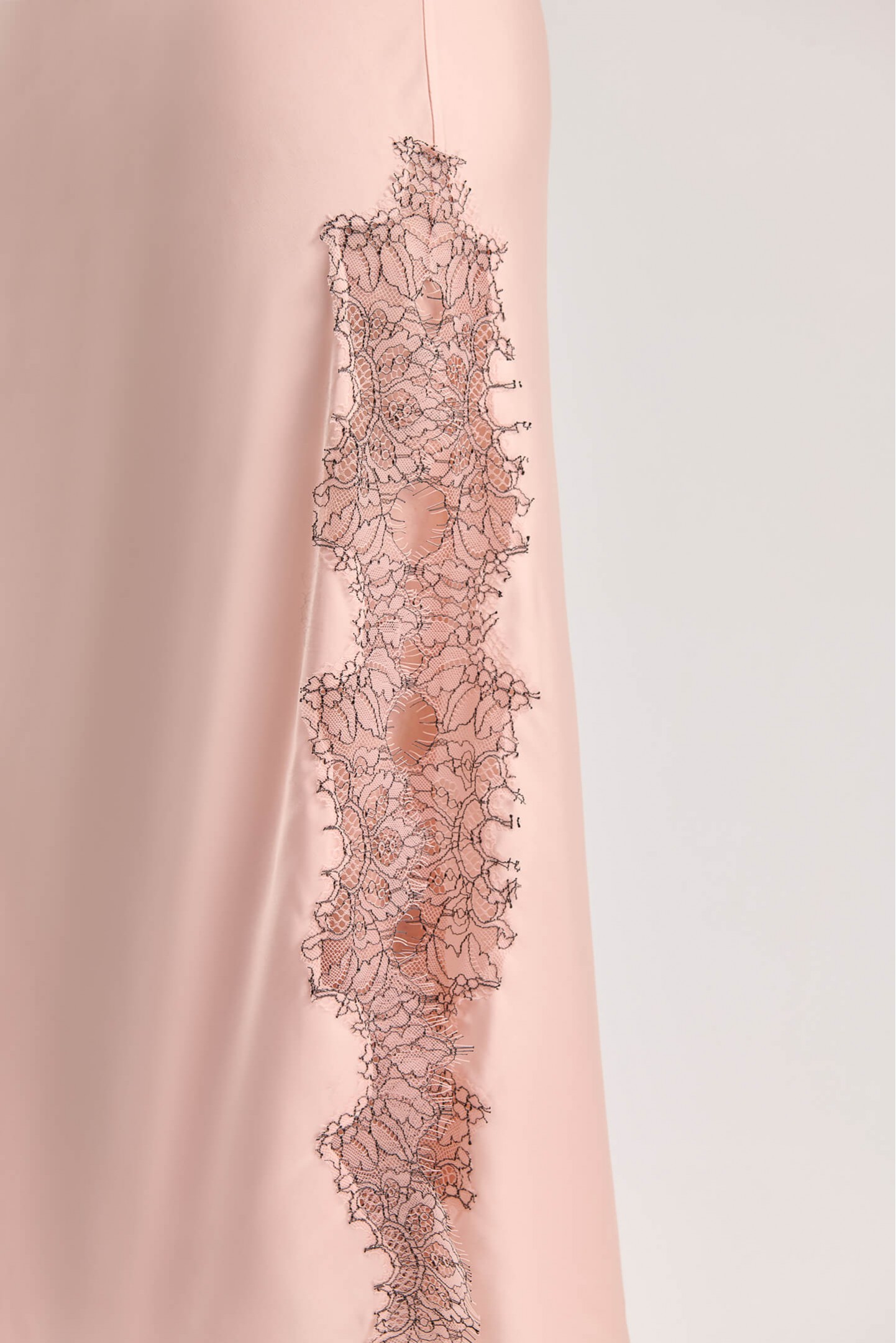 The fitted silhouette hugs the body gracefully, while the lace trim adds romantic texture to this classic midi shape. Whether styled with minimal jewelry or bold heels, this piece stands confidently on its own.