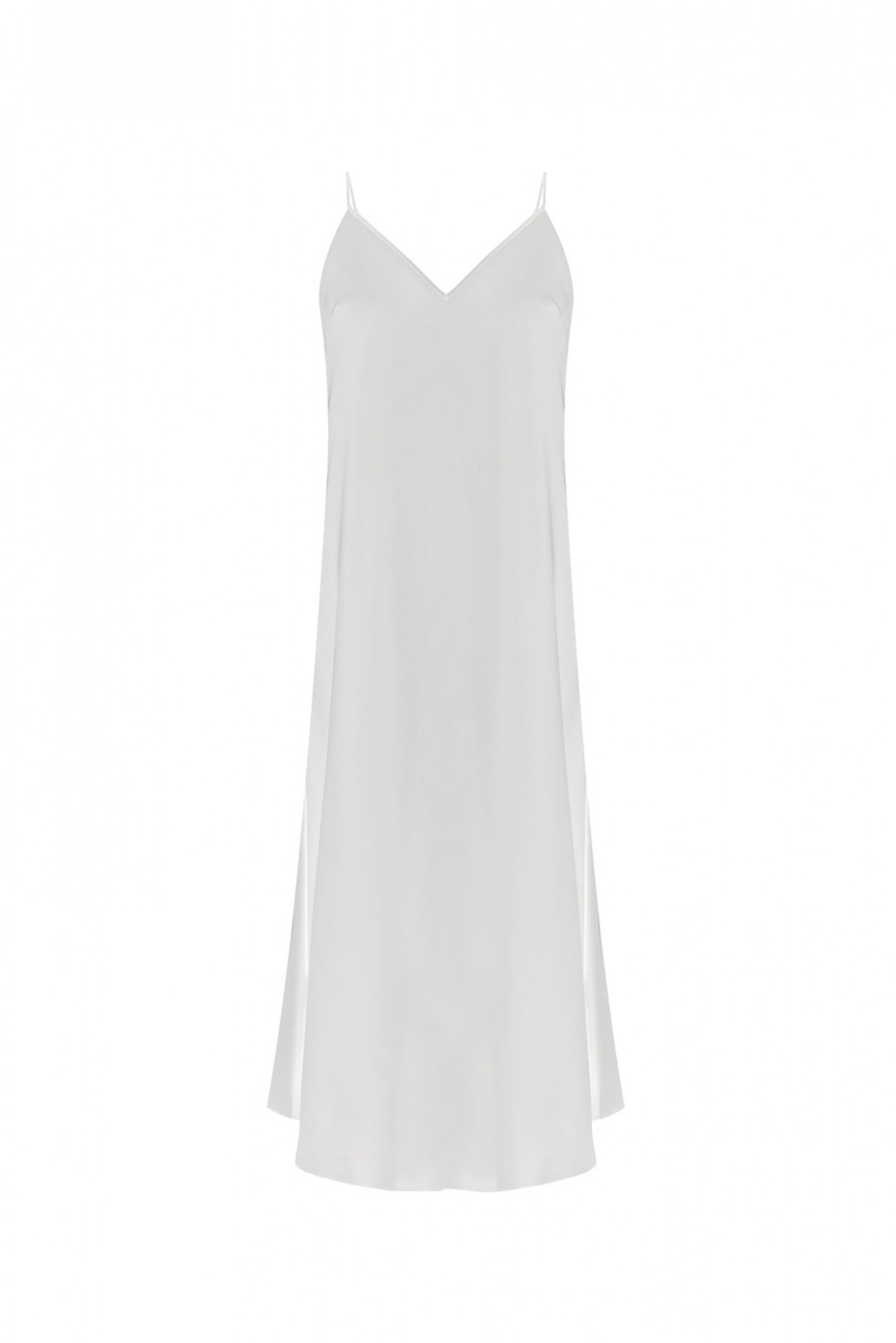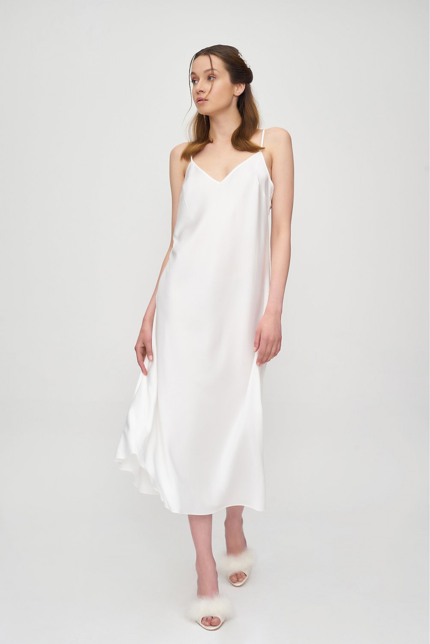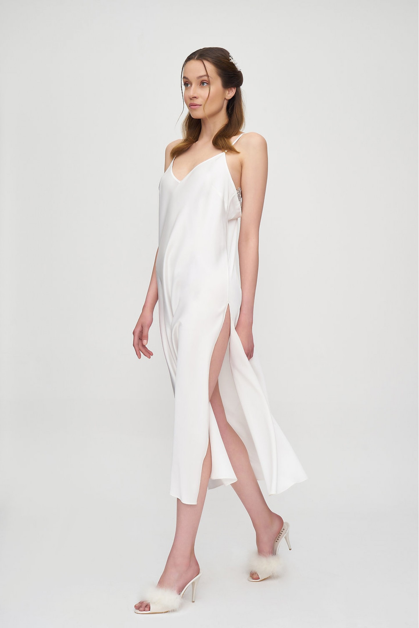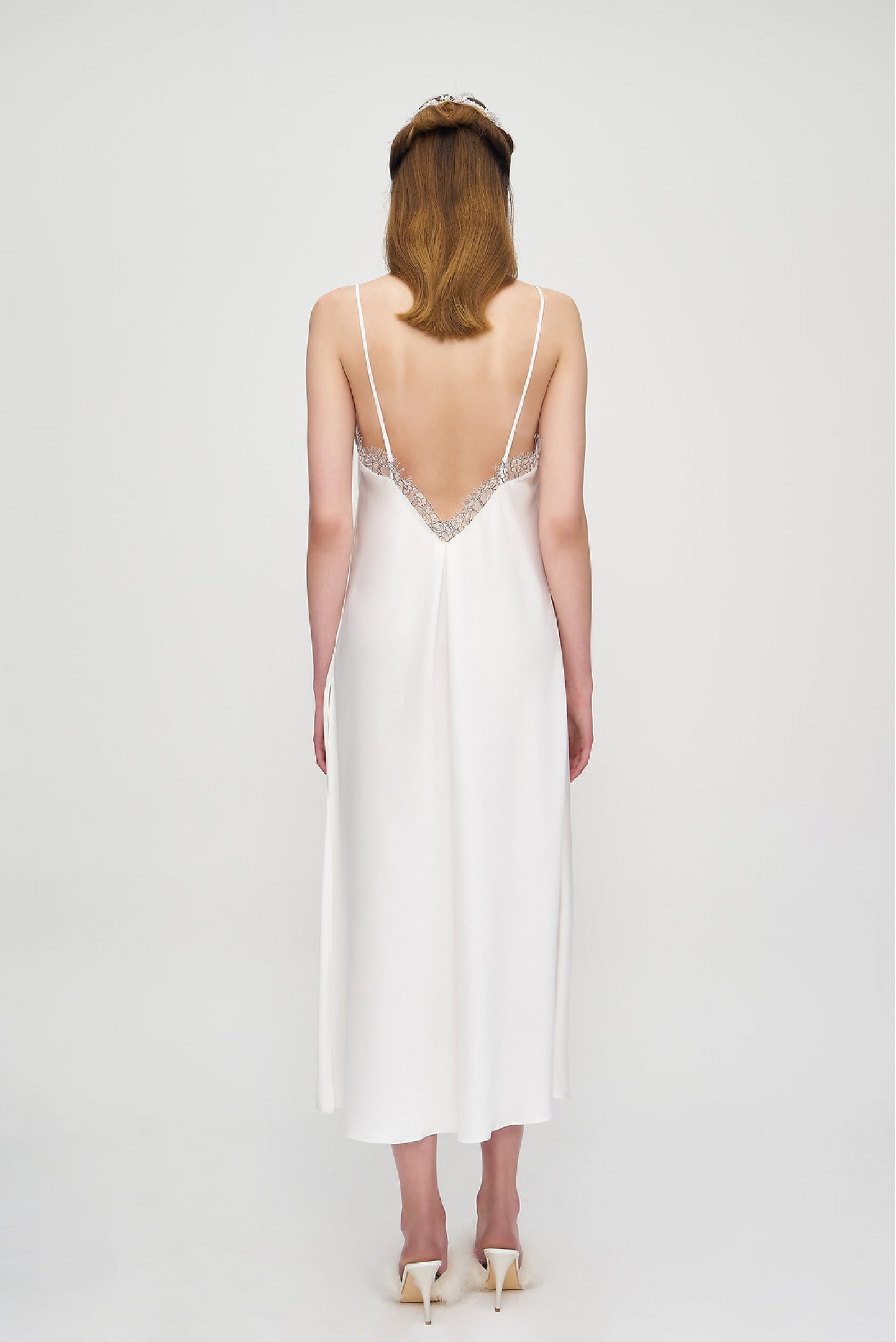 With clean lines, adjustable straps, and crafted from silky-smooth silk fabric, this dress offers a graceful side slit that brings effortless movement and a touch of edge. The gently tapered waist creates an elegant silhouette, while the delicate lace paneling at the back adds a soft, unexpected detail — perfect for those who appreciate quiet elegance with a twist.