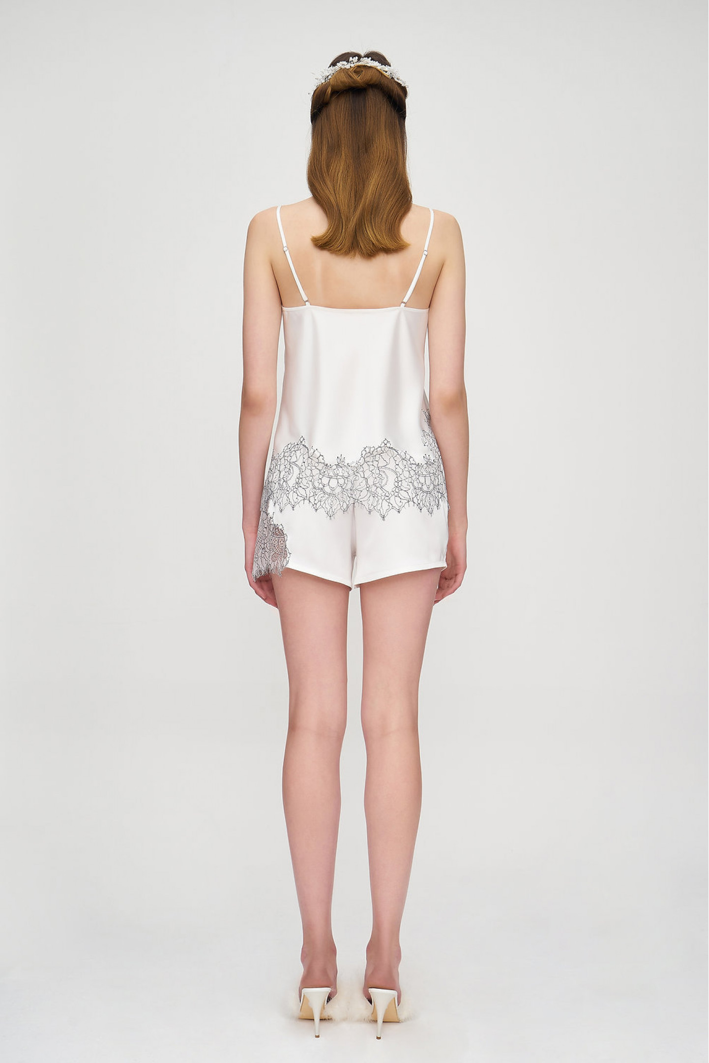 Its relaxed fit, adjustable straps, and delicate lace neckline offer comfort, versatility, and a touch of femininity, while the gently tapered waist and lace-trimmed hem create a flattering silhouette. Whether paired with tailored pants, styled with its matching silk shorts, layered under a blazer, or contrasted with denim, it transitions seamlessly from day to night.