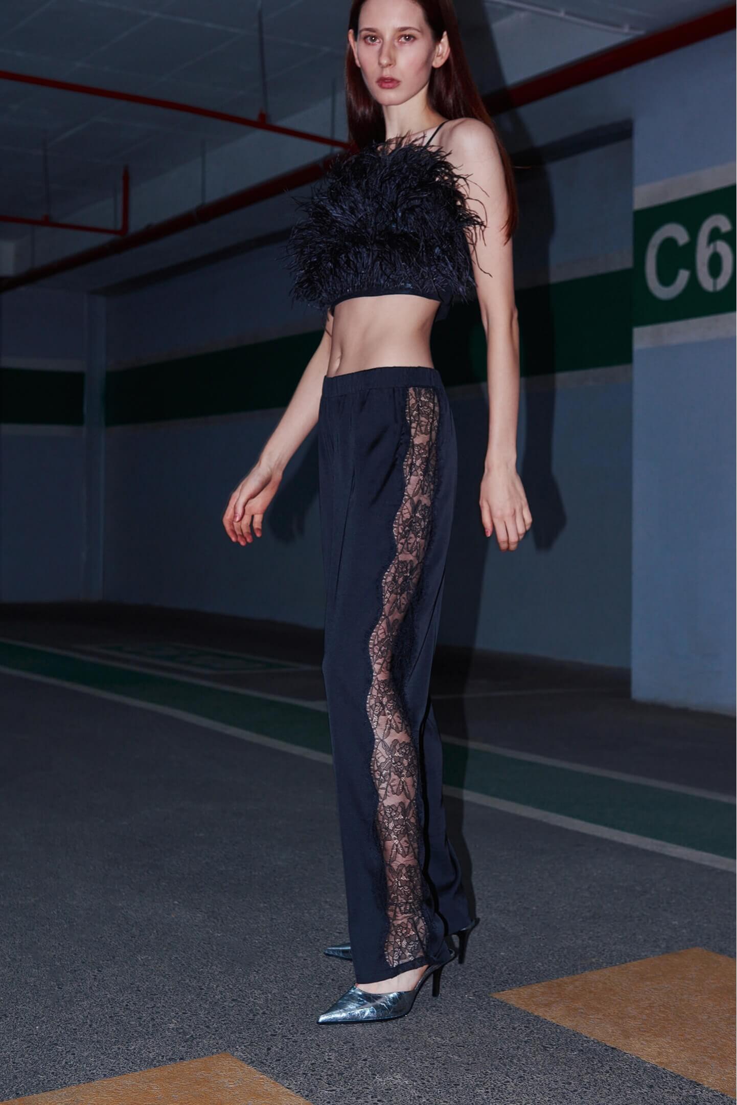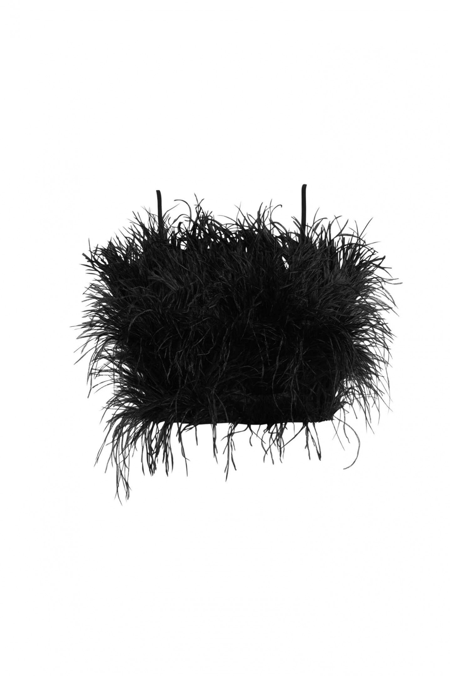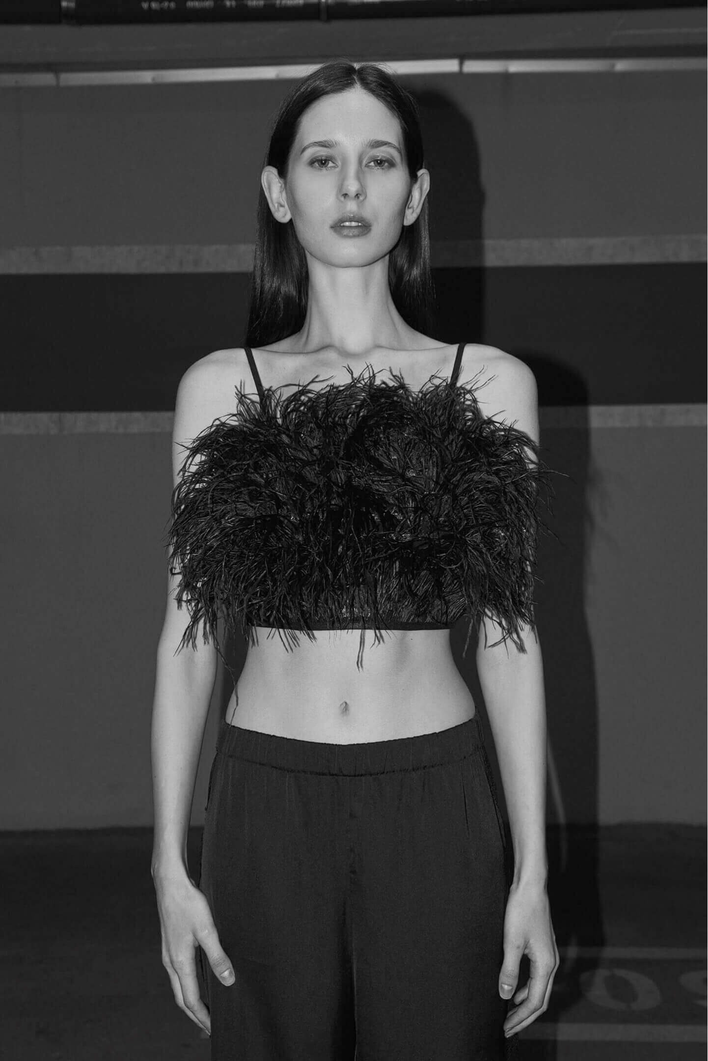 Crop top featuring ostrich details at front. Thin shoulder straps.