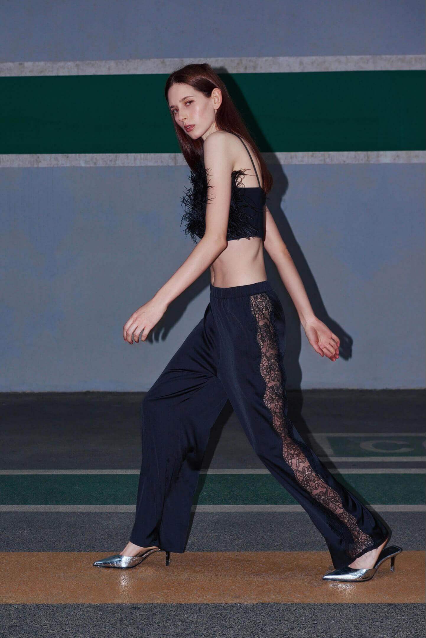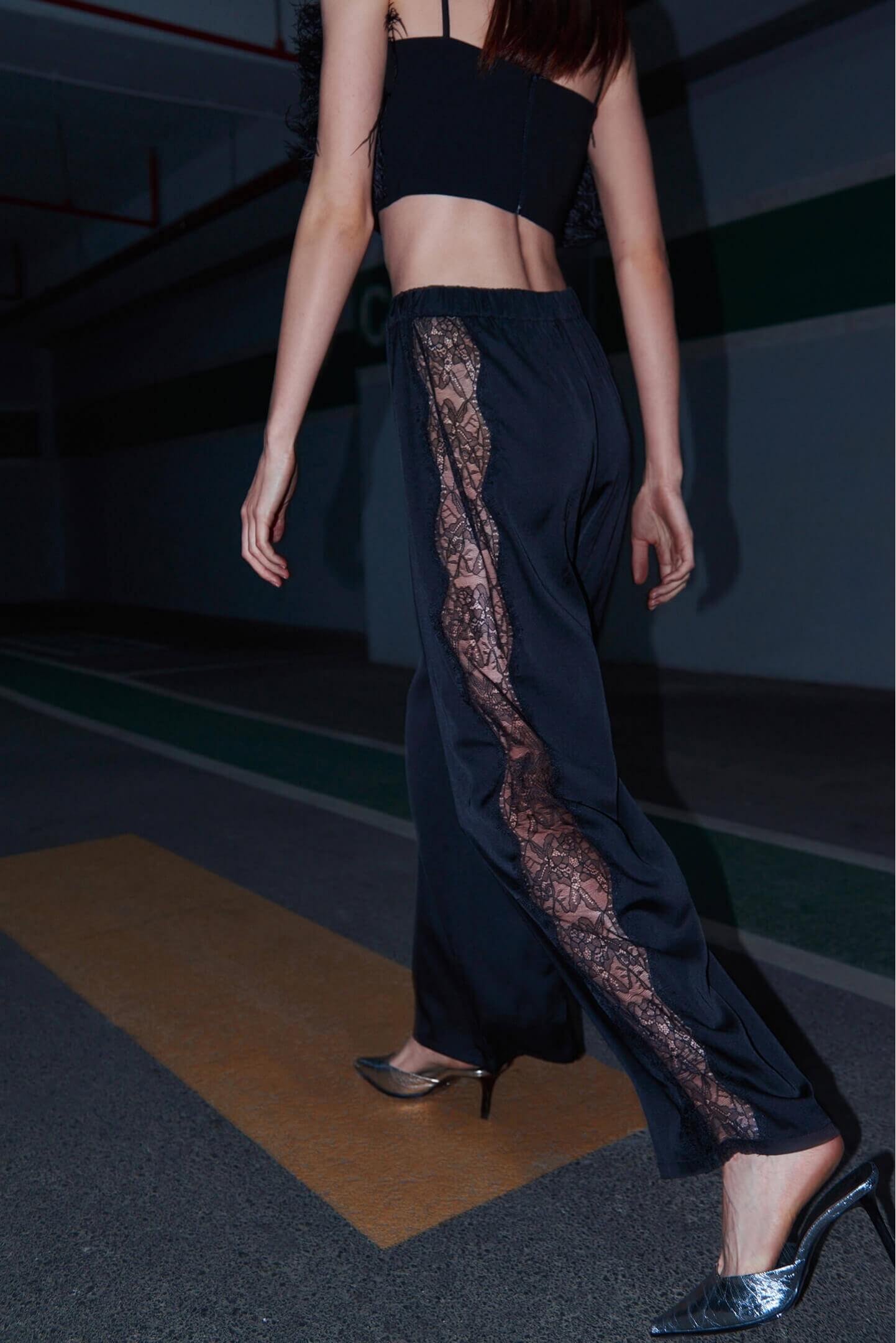 Chic and romantic all at once, the Lace Detailed Pants bring a fresh, feminine edge to modern tailoring. Designed with intricate lace paneling along the sides, a comfortable waistband, and a sleek, elongated silhouette, these pants offer a soft contrast between structure and delicacy — perfect for elevated daytime looks or bold evening styling.