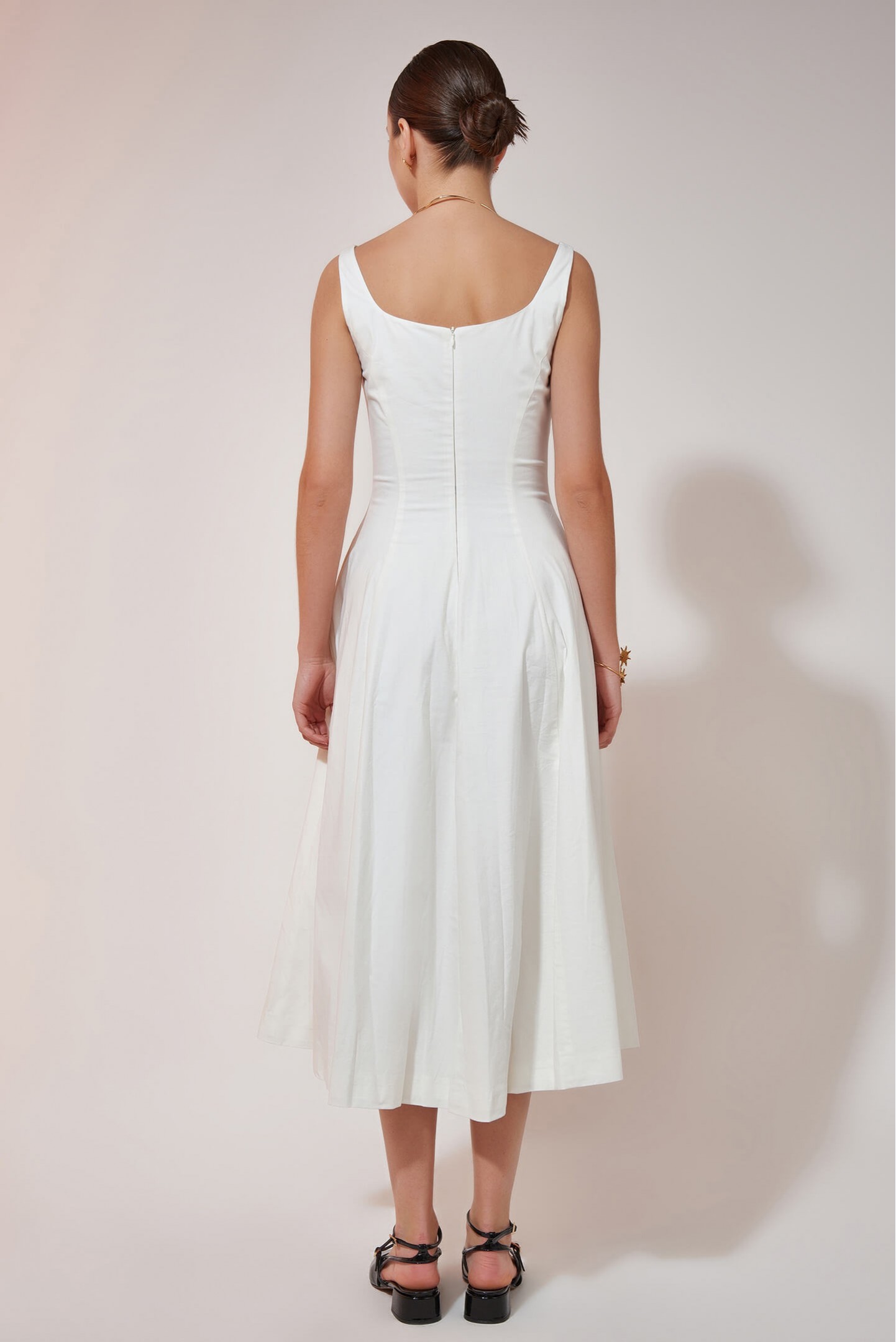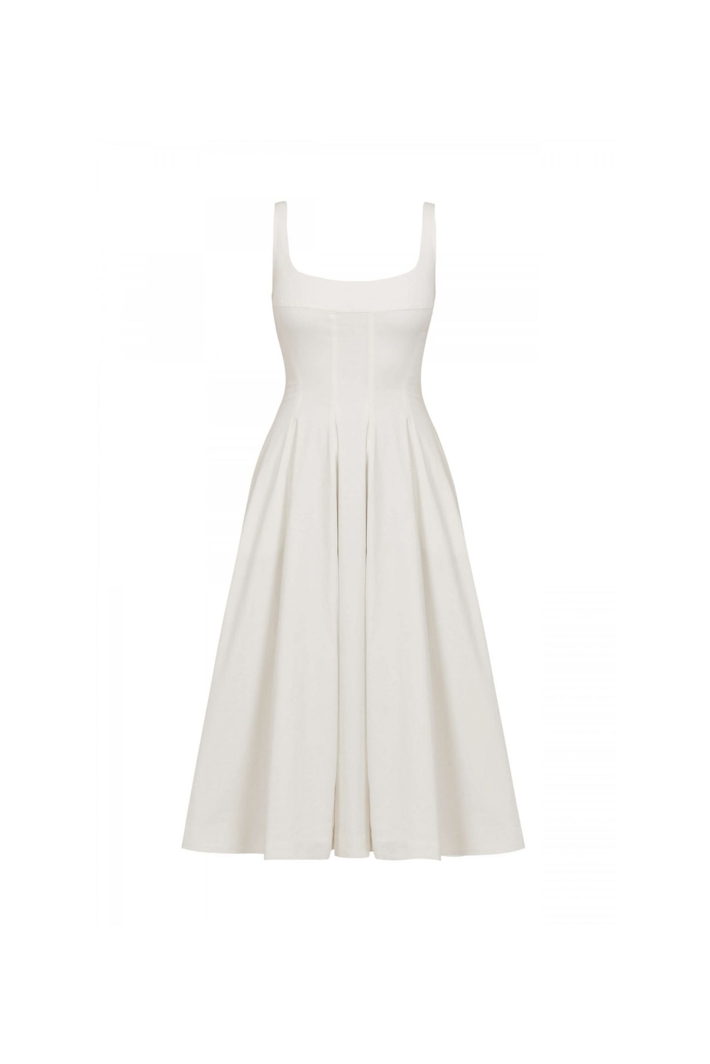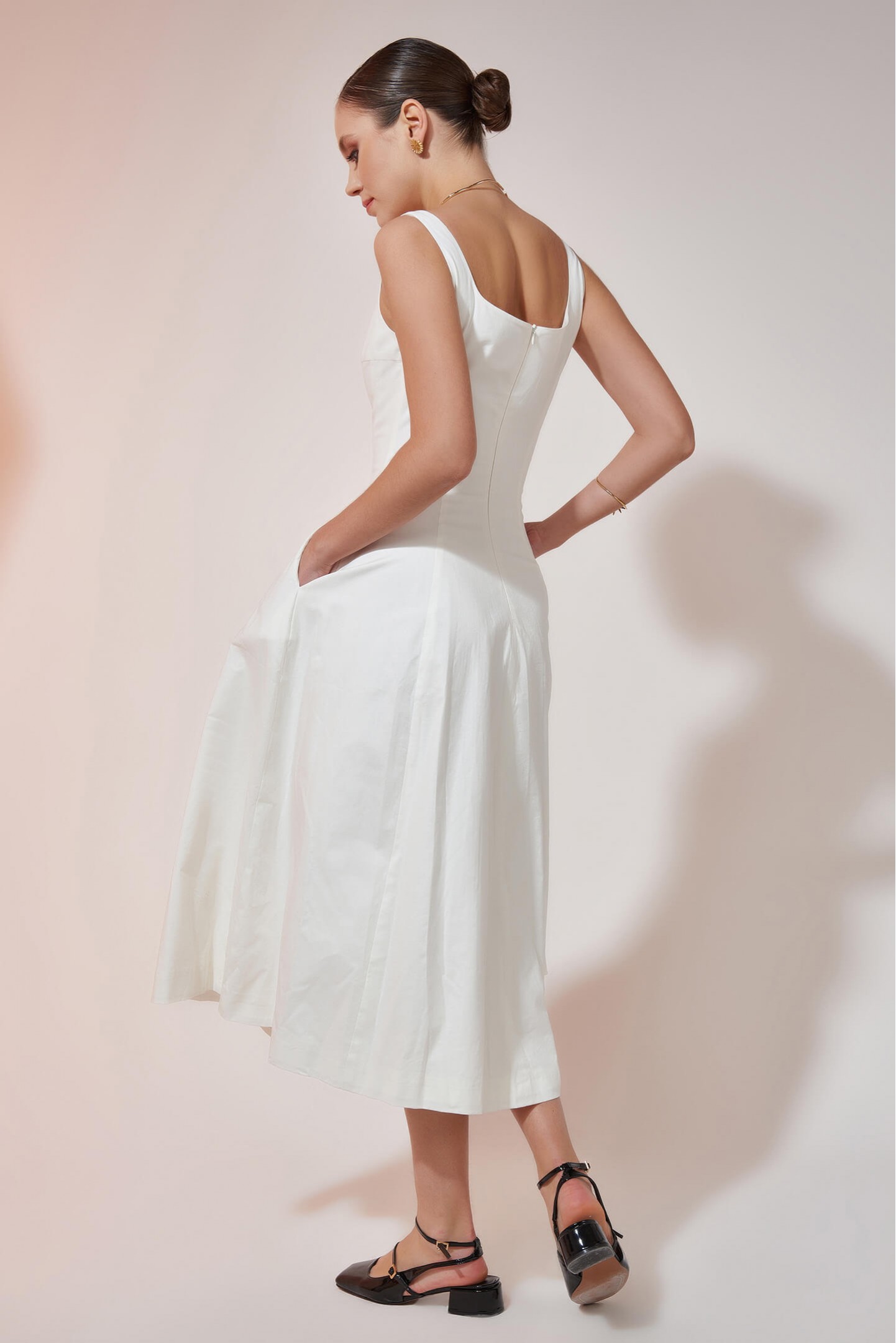 Mid-length dress presents a flared silhouette that is highlighted with pleat details at the lower waist.