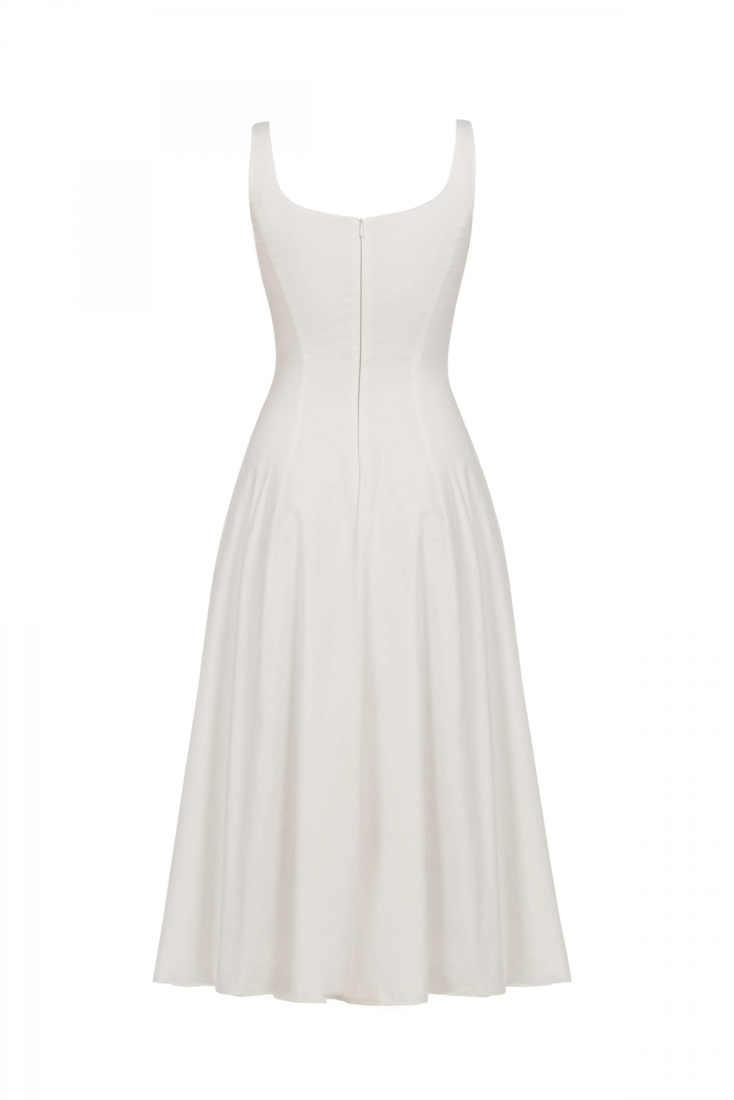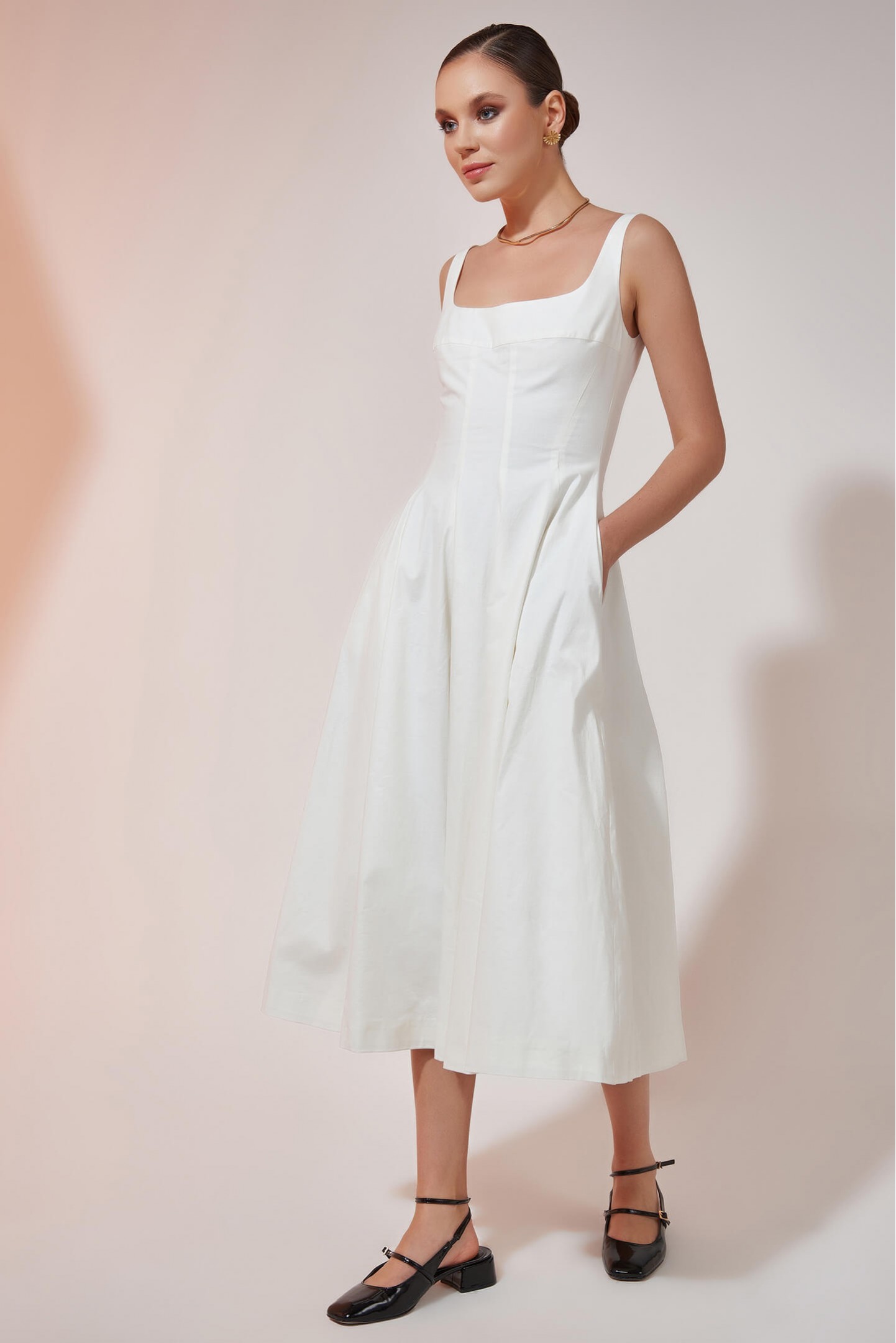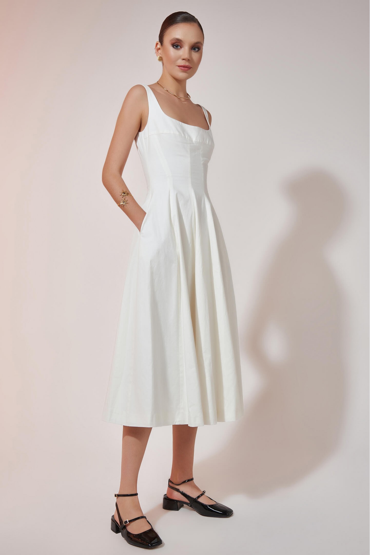 Mid-length dress presents a flared silhouette that is highlighted with pleat details at the lower waist.