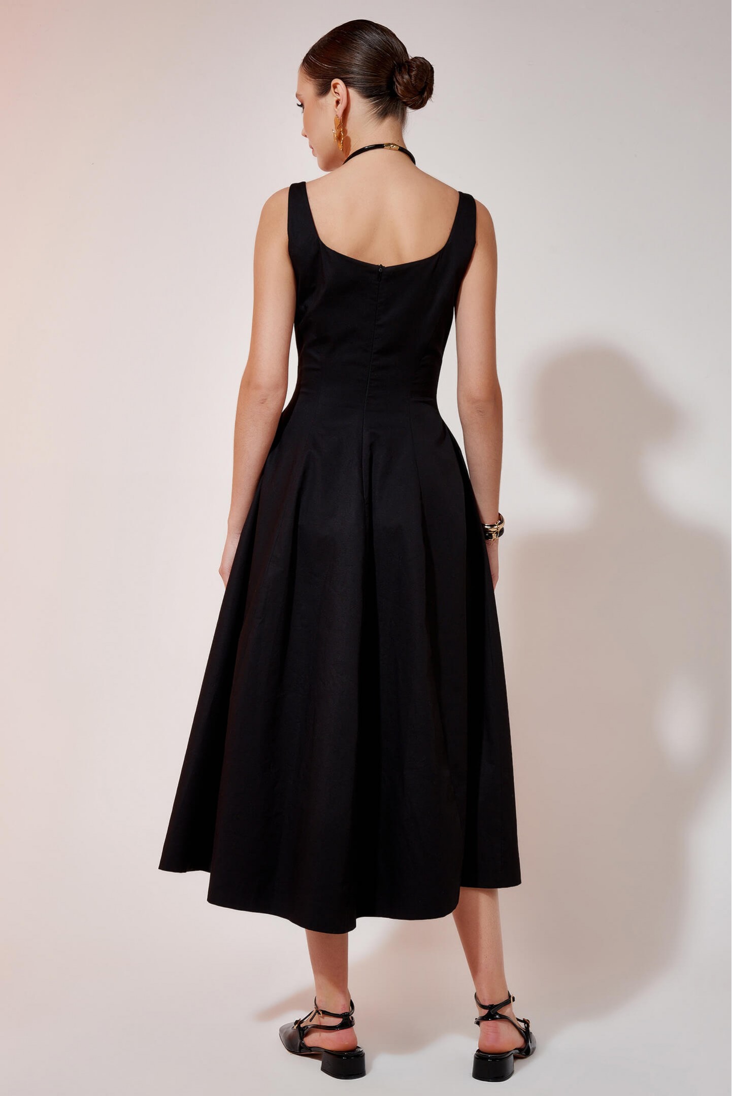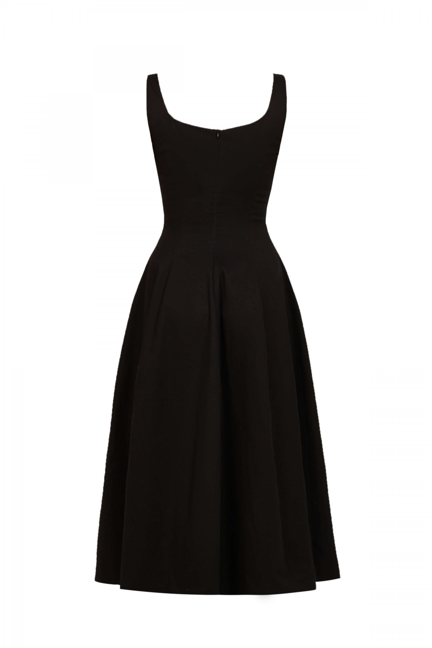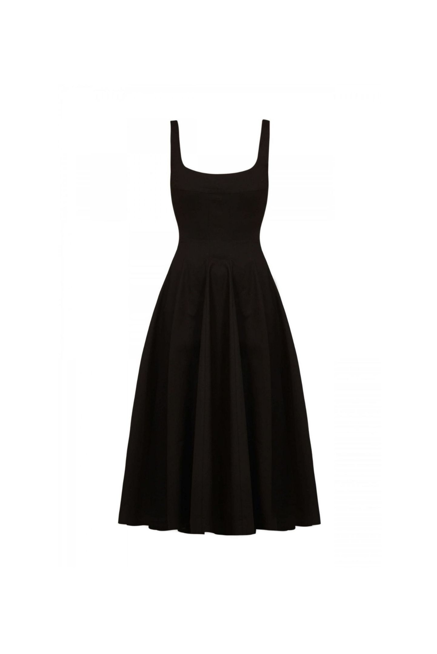 Mid-length dress presents a flared silhouette that is highlighted with pleat details at the lower waist.