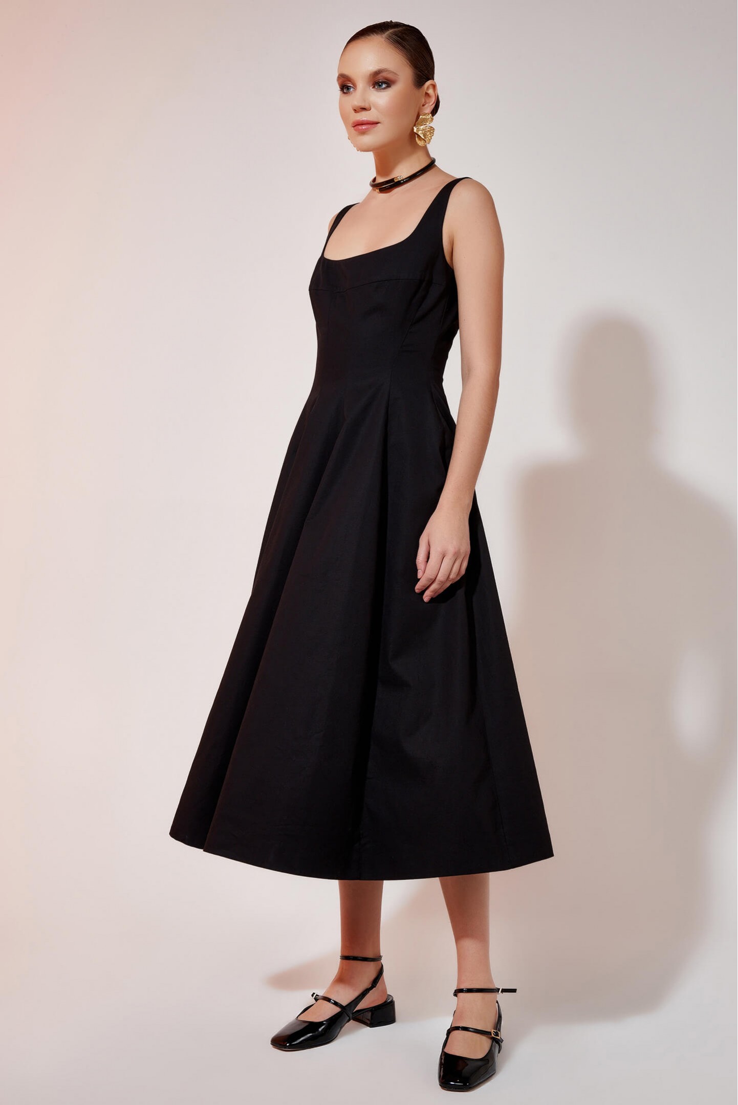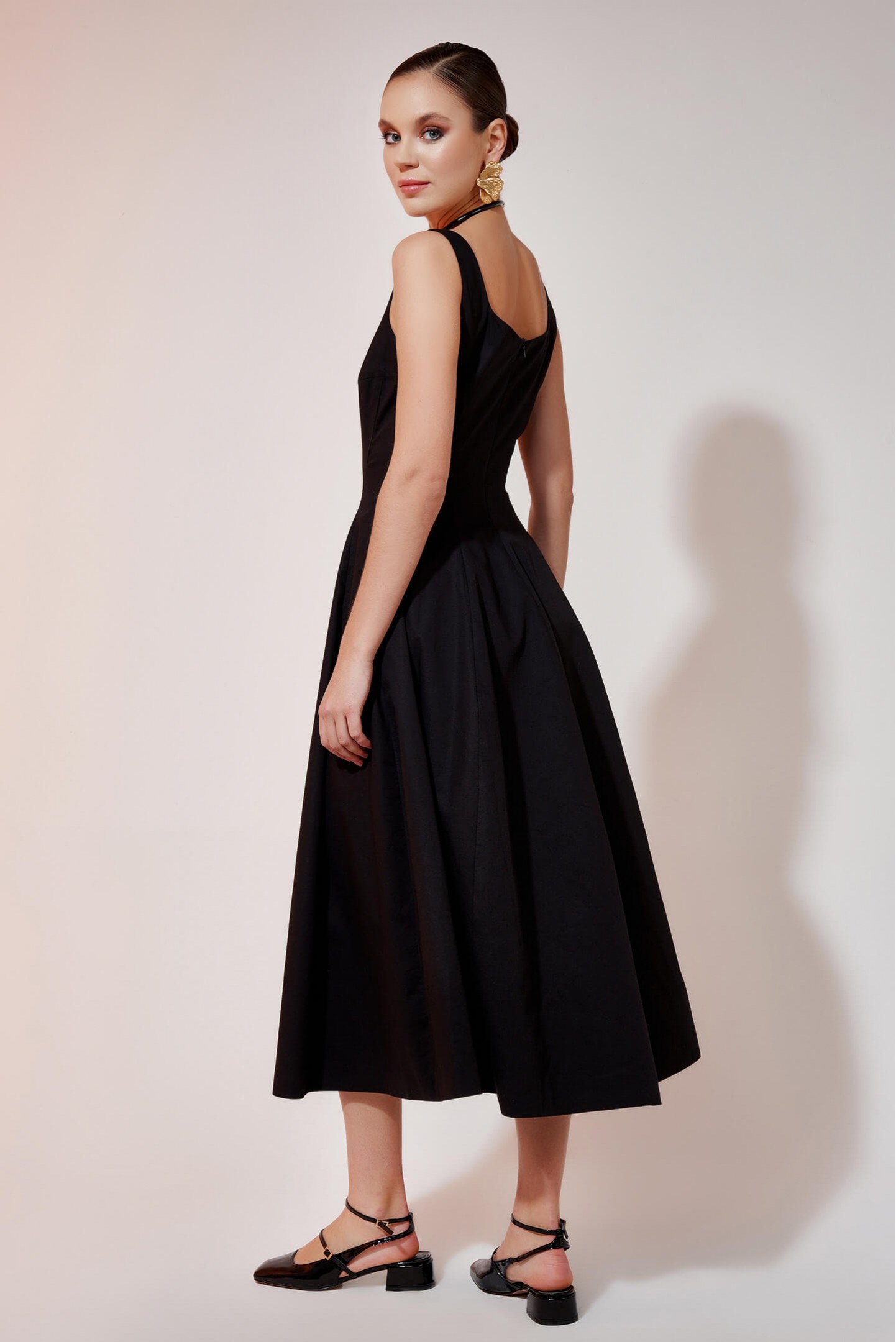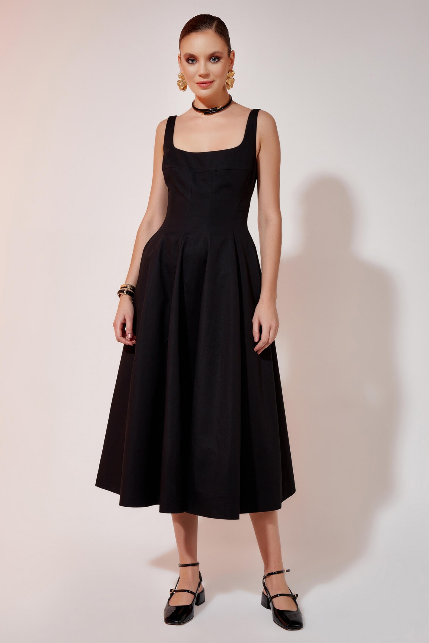 Mid-length dress presents a flared silhouette that is highlighted with pleat details at the lower waist.