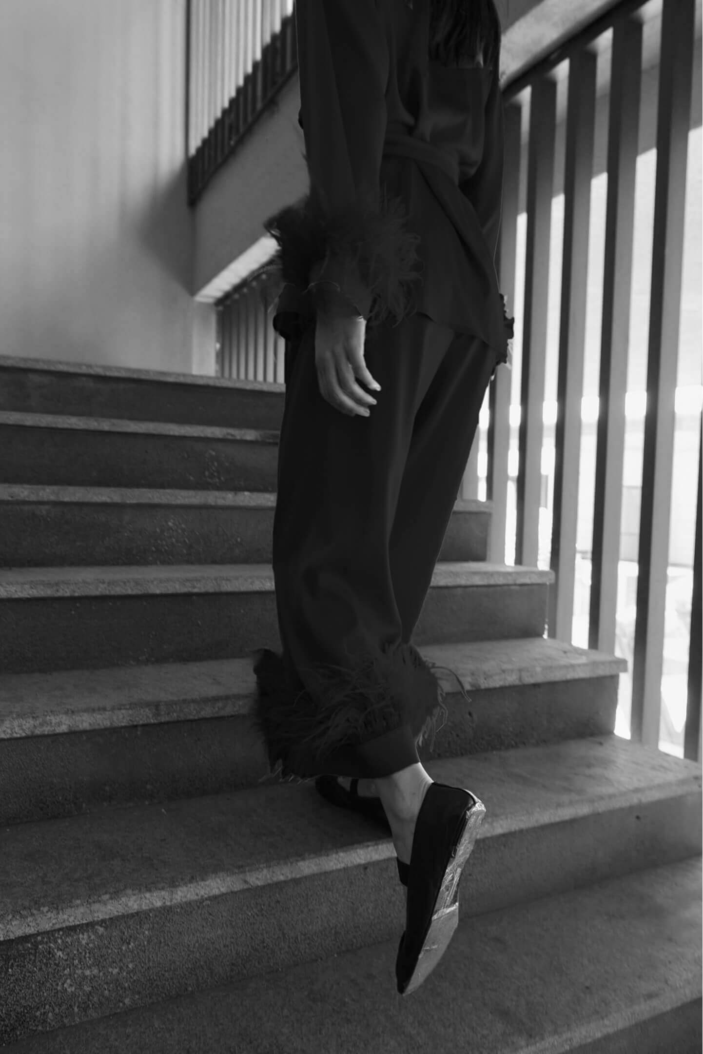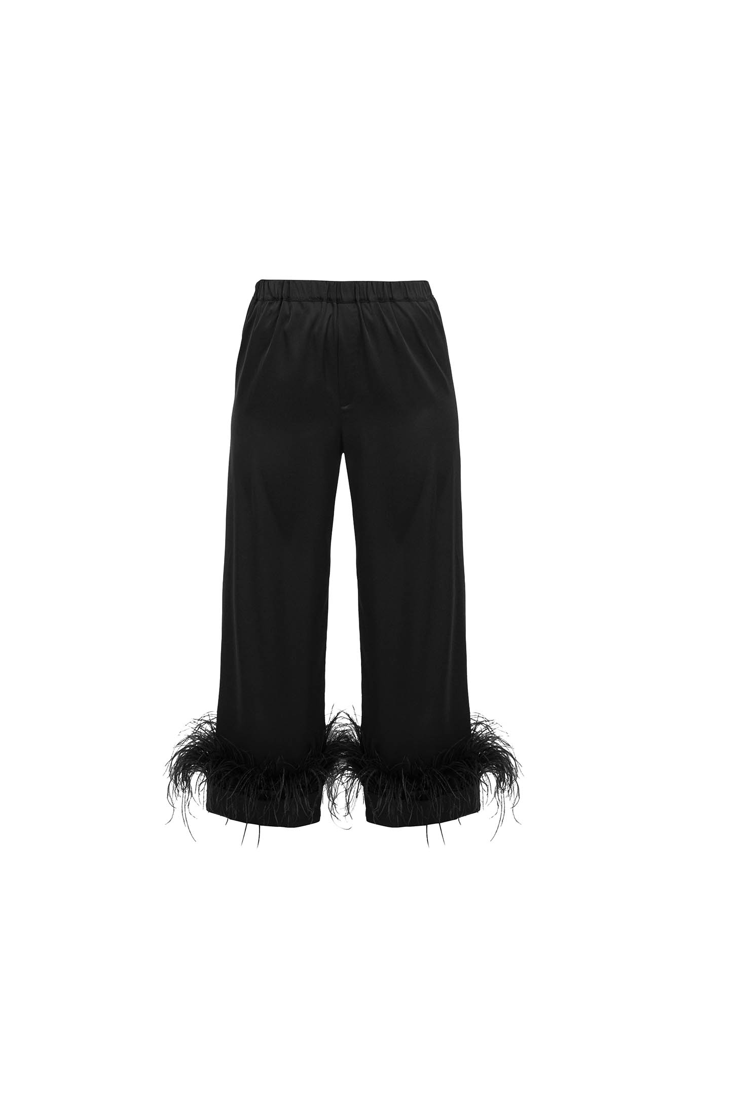 A striking blend of fluidity and flair, the Ostrich Feather Silk Pants offer effortless luxury with a dramatic twist. Crafted from smooth, flowing silk, these straight-leg pants are finished with ethically sourced ostrich feather trim at the hem — adding soft volume and bold movement with every step.