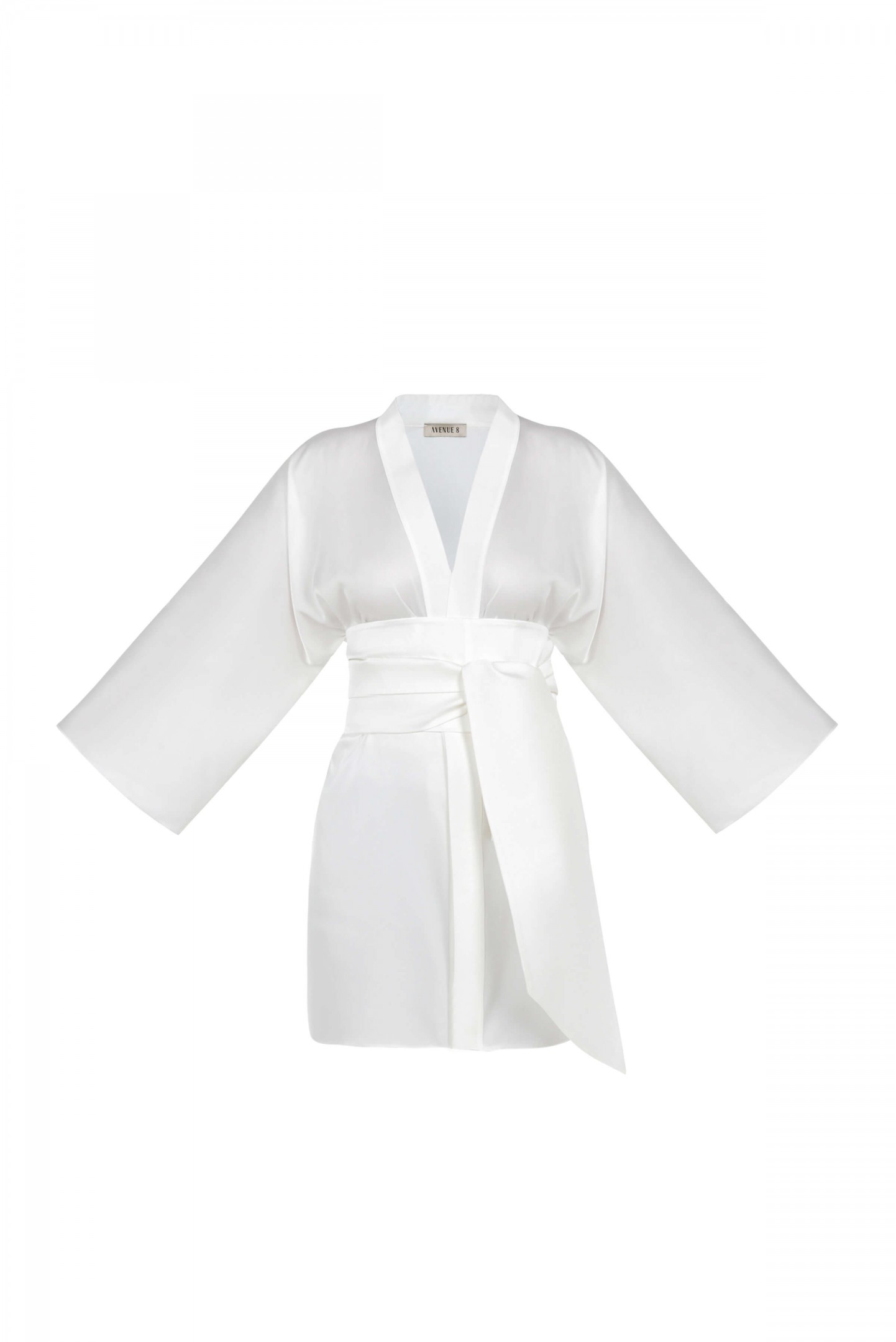 A detachable, sculptural wide belt defines the waist, offering structured elegance and an adjustable fit. With its minimalist silhouette, graceful drape, and subtle sheen, it moves with intention — ideal for bridal prep, elevated lounging, or evening layering.