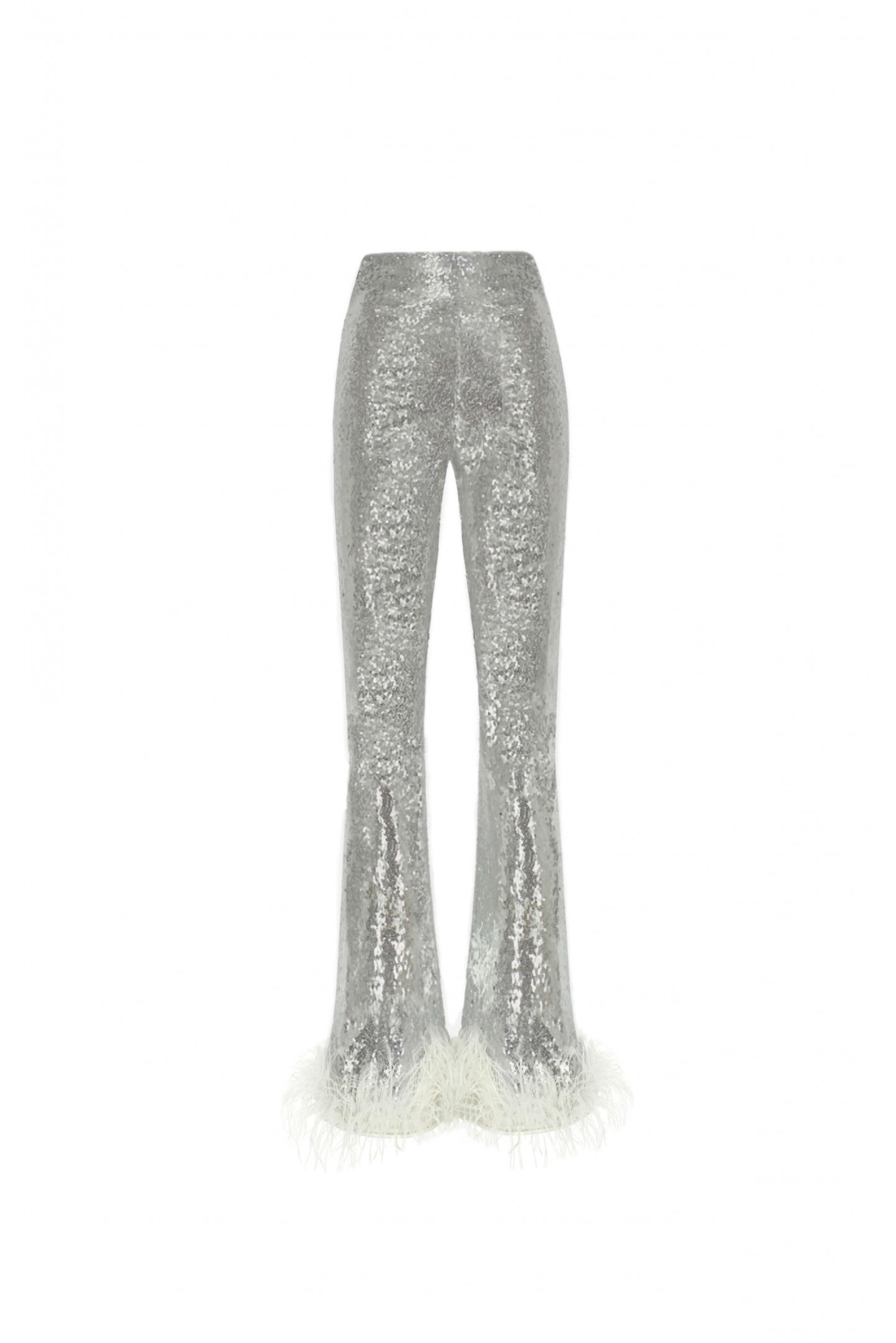 Ostrich Feather Sequined Pants crafted with shimmering sequins that catch the light and trimmed with luxurious ostrich feathers along the hem offer a dramatic, high-fashion look. Perfect for making a statement at special events or glamorous nights out, they combine opulence with playful elegance.