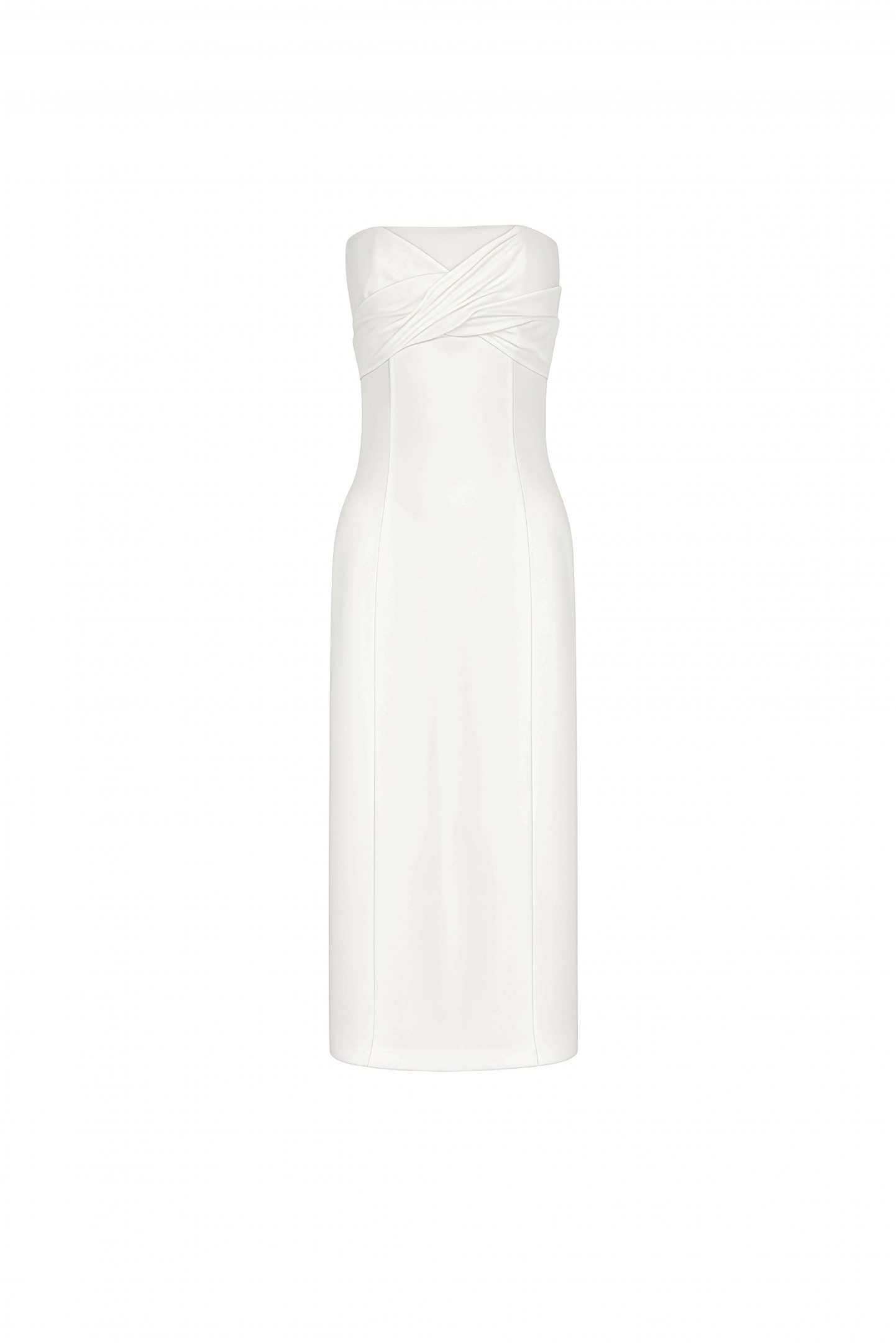 A strapless midi crepe dress features a strapless neckline and twisted draped details on the breast.