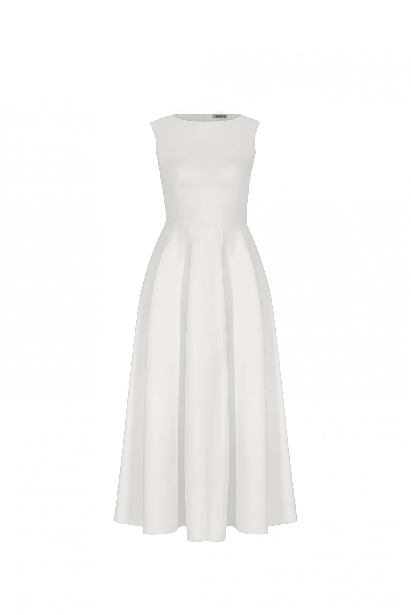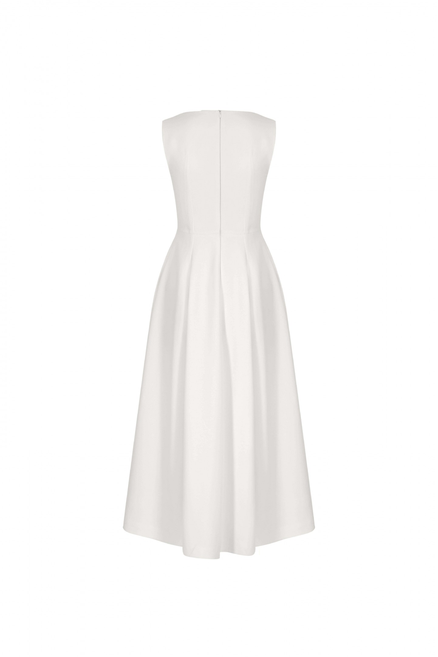 The mid-length dress, expertly crafted from lightweight black wool and silk, boasts a flared silhouette with striking architectural lines that elegantly accentuate the waist.