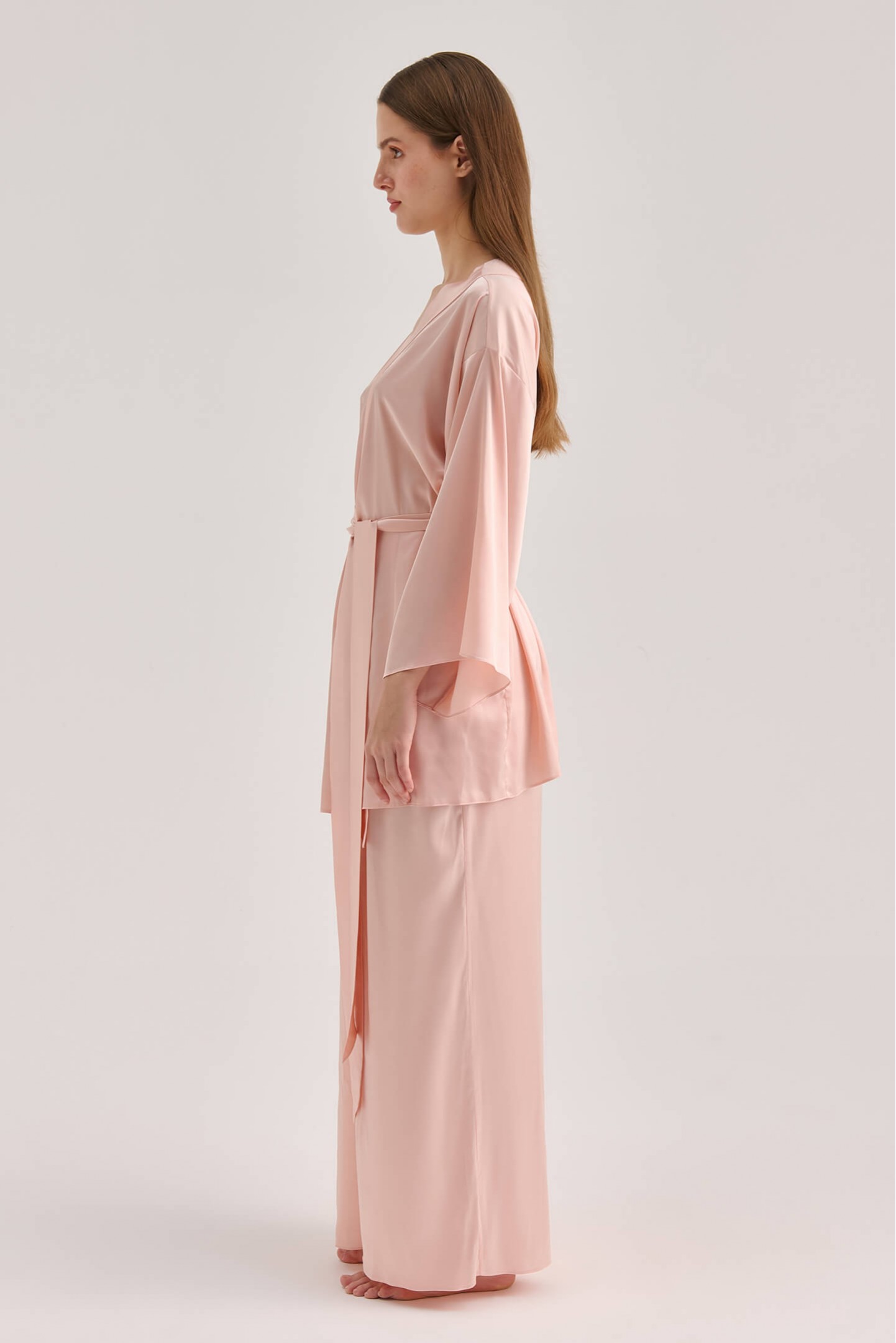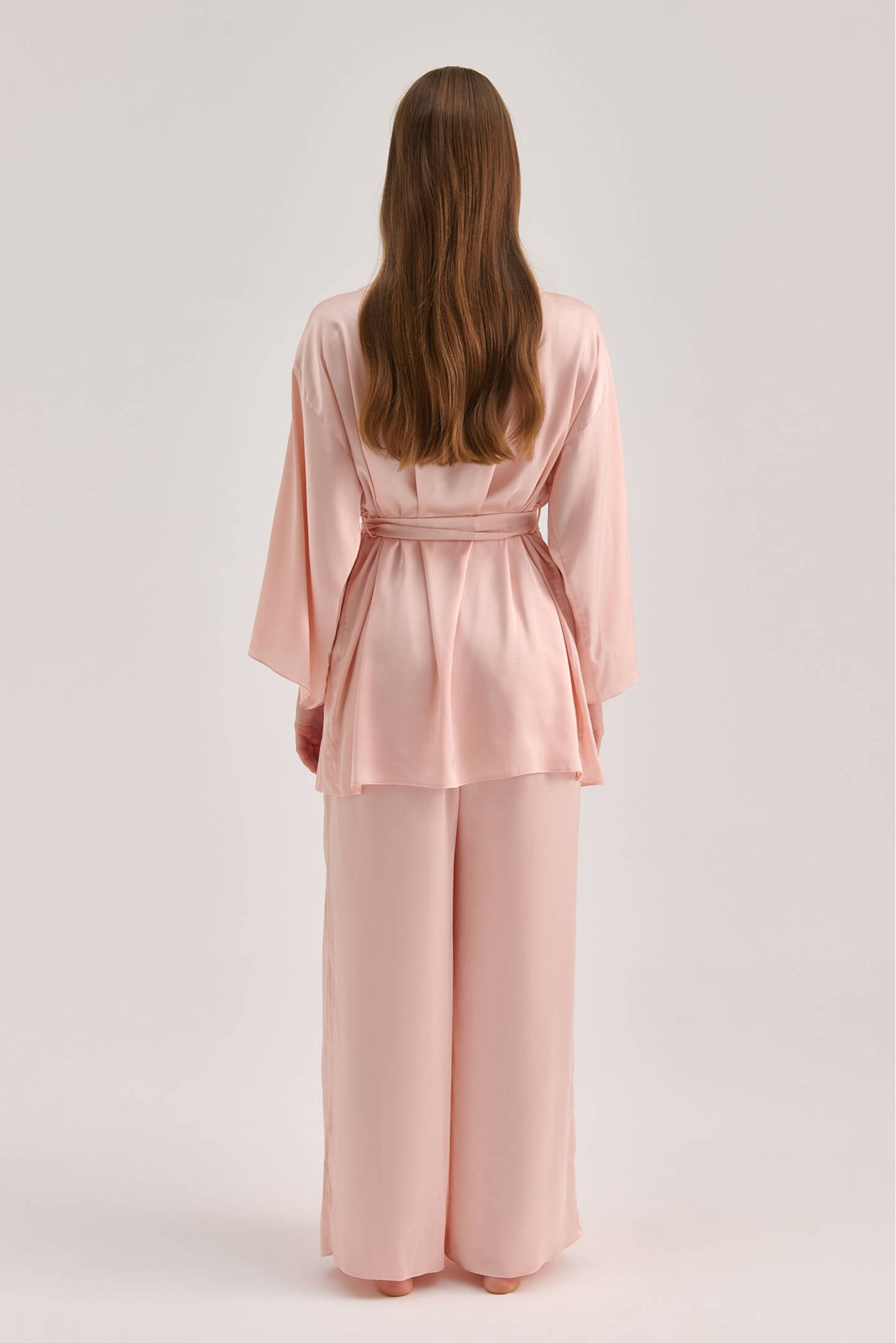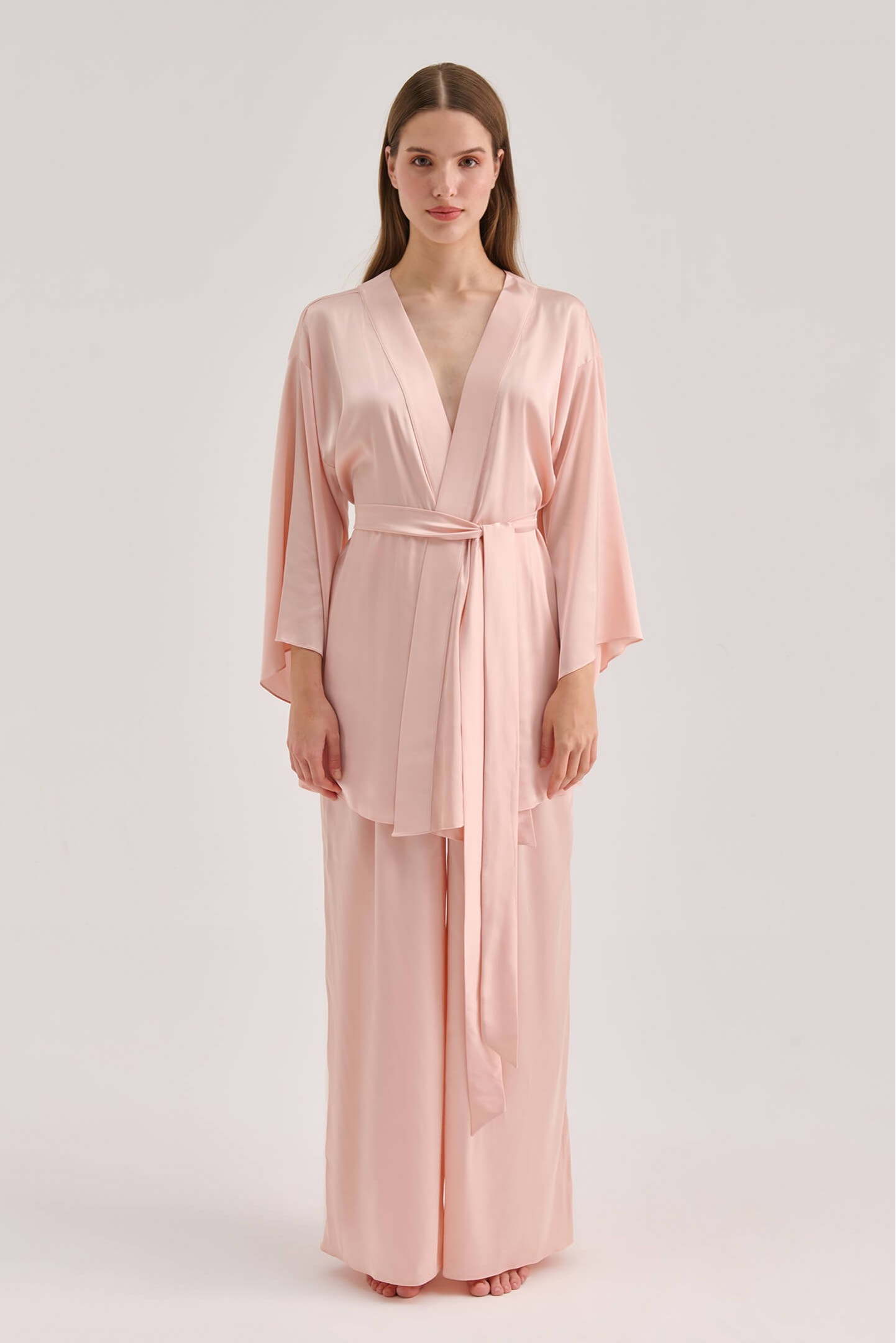 A hidden side zipper ensures a smooth, minimal finish at the waistline — no elastic, no bulk, just seamless elegance. Ideal for bridal prep, relaxed evenings, or a polished day-to-night look.