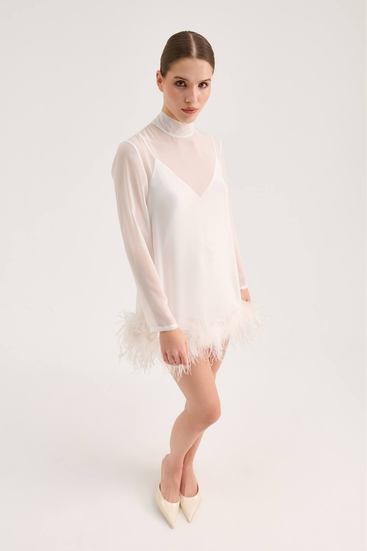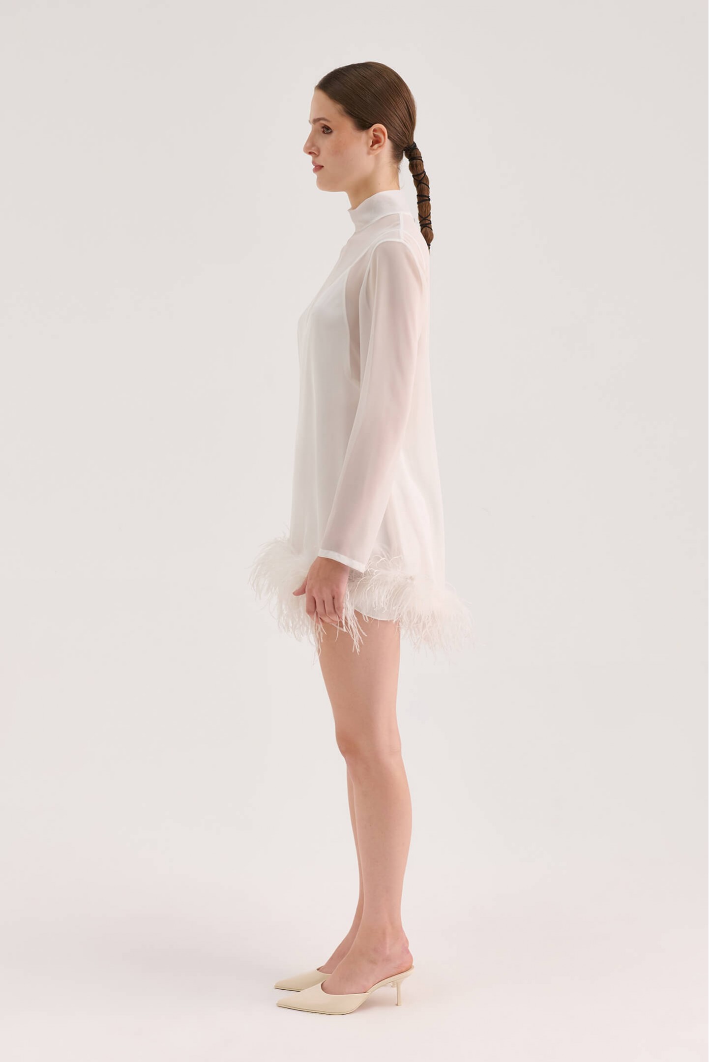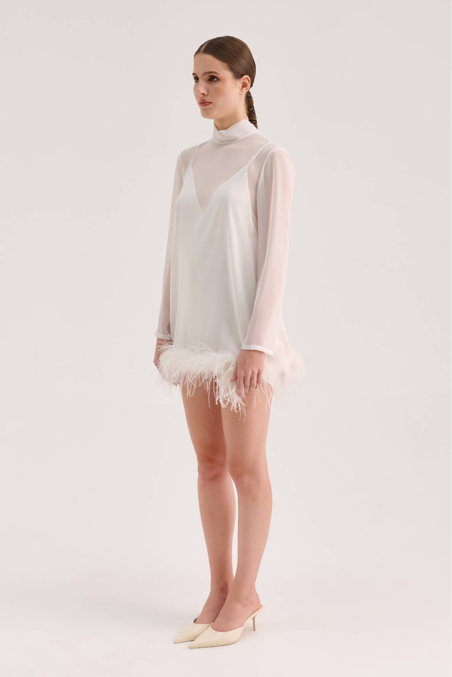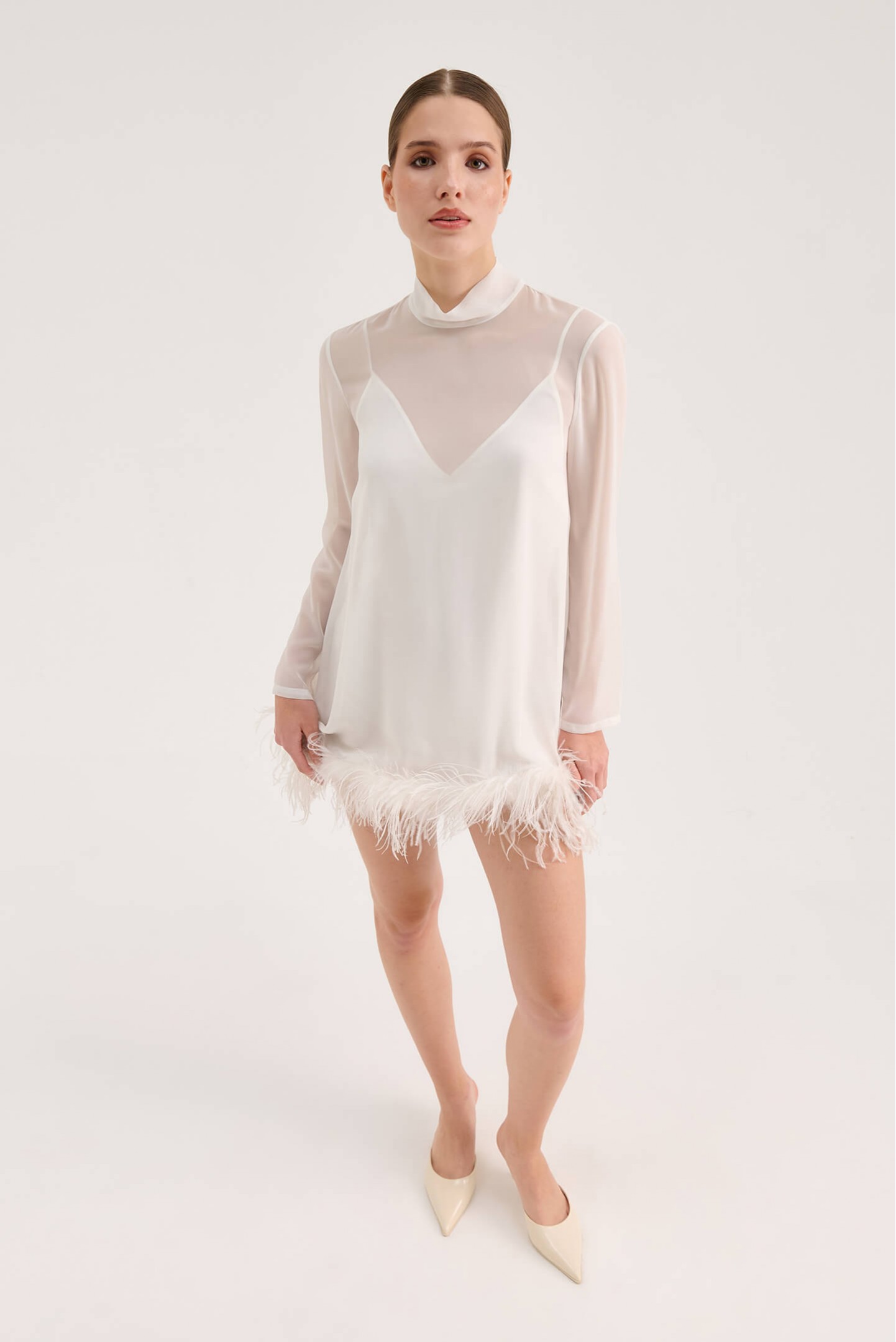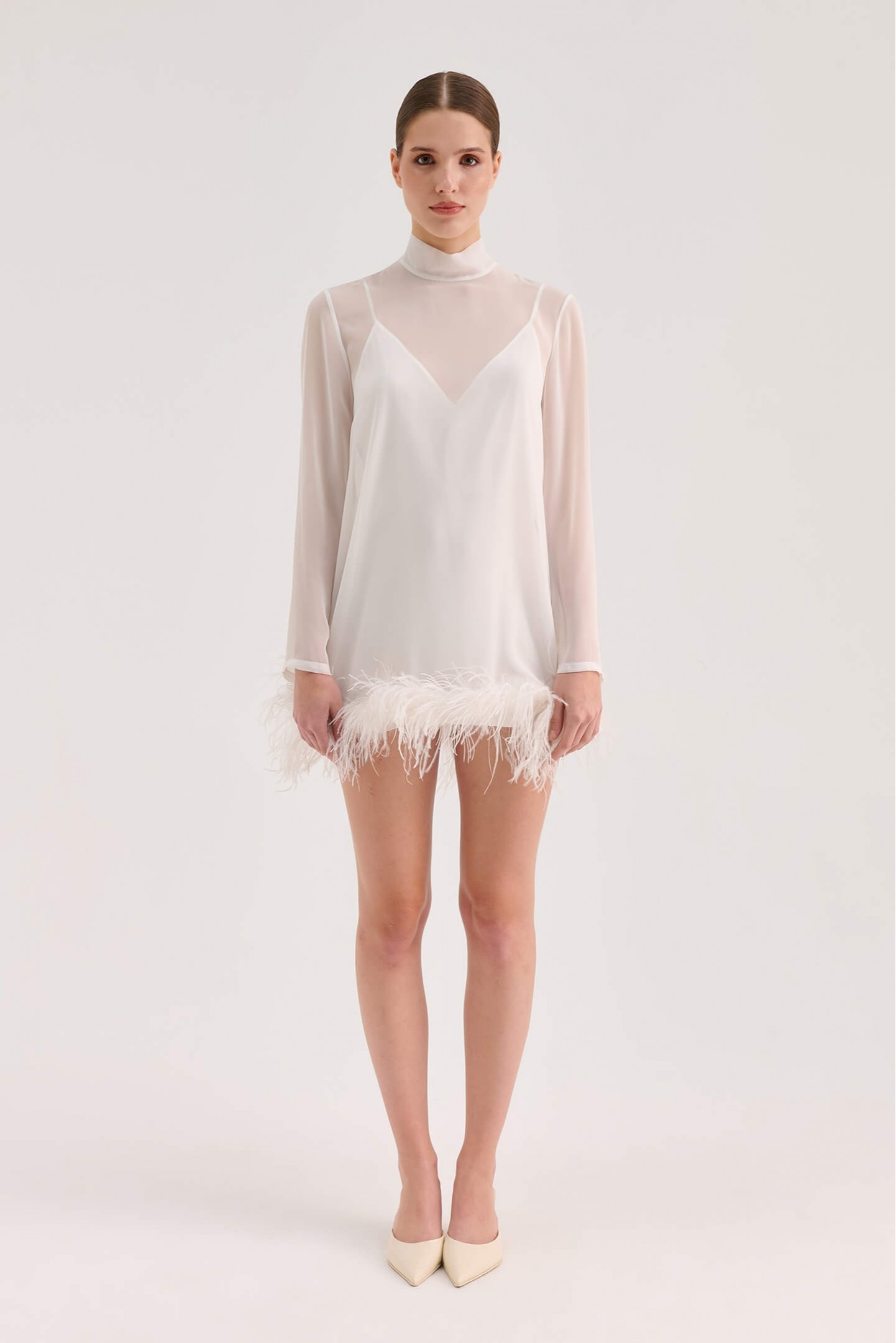A turtleneck-detailed transparent mini dress features feather details on the skirt and a cut-out detail at the back.
