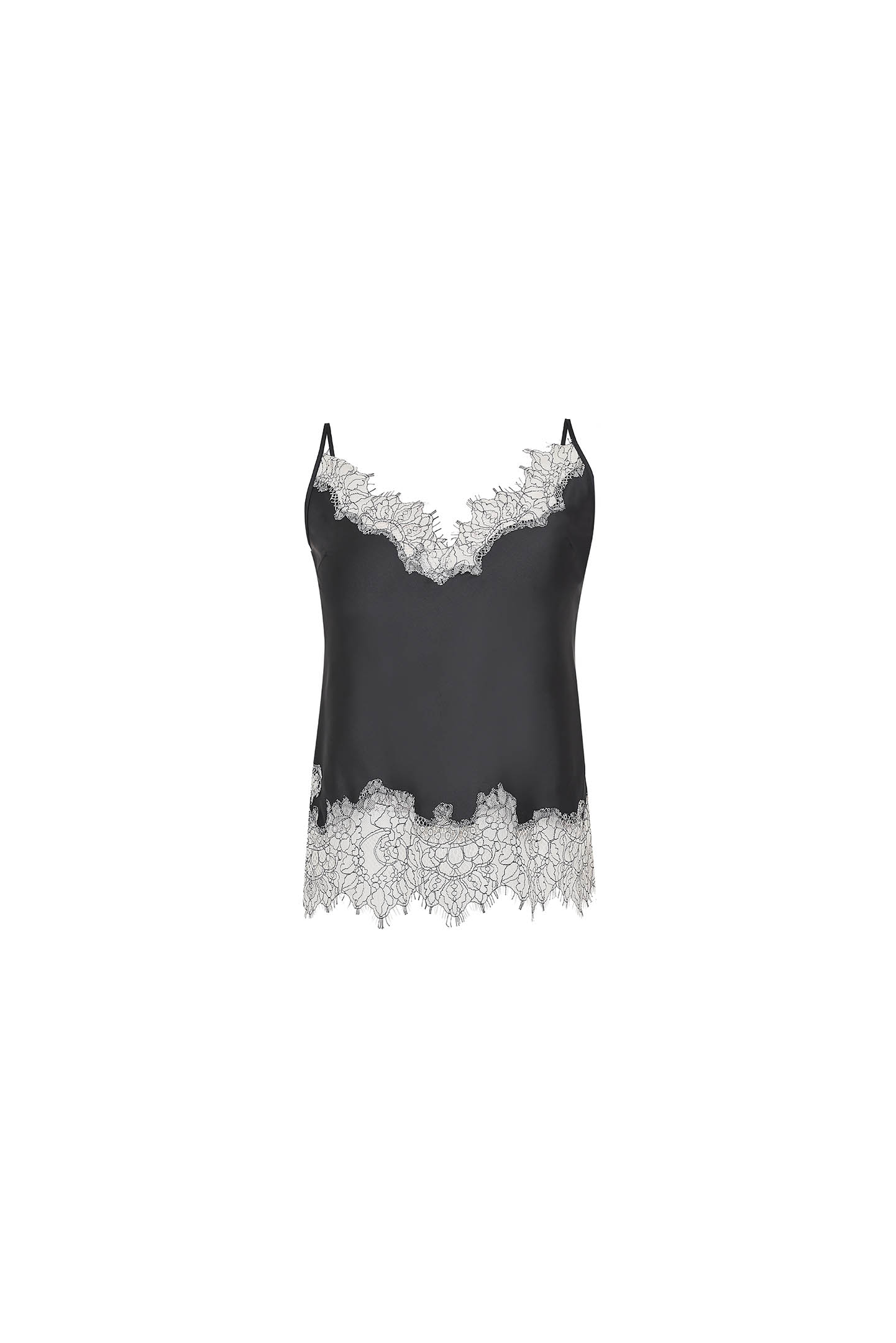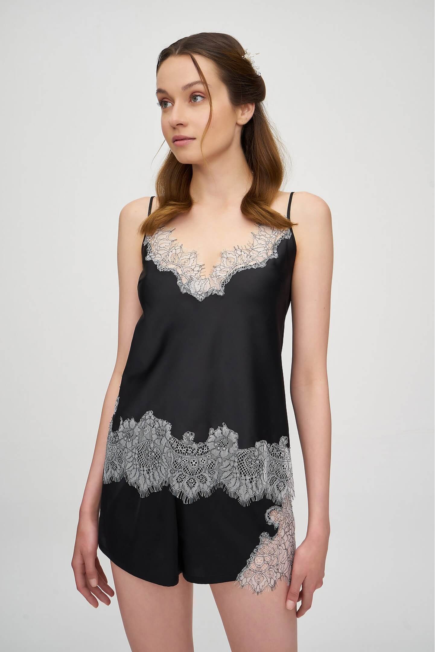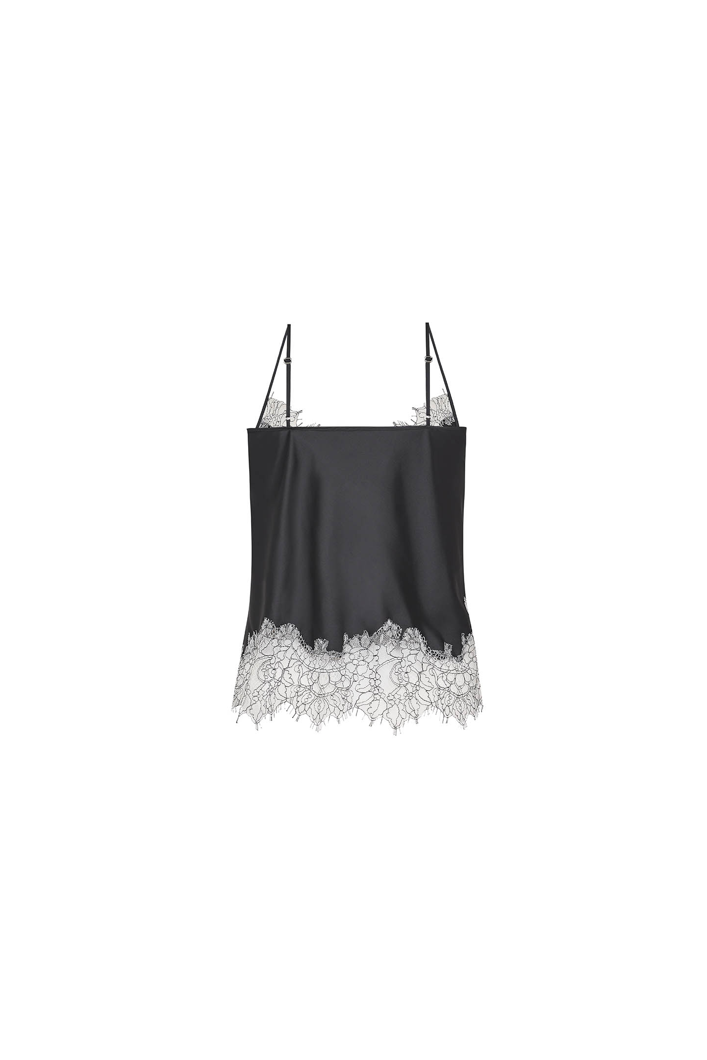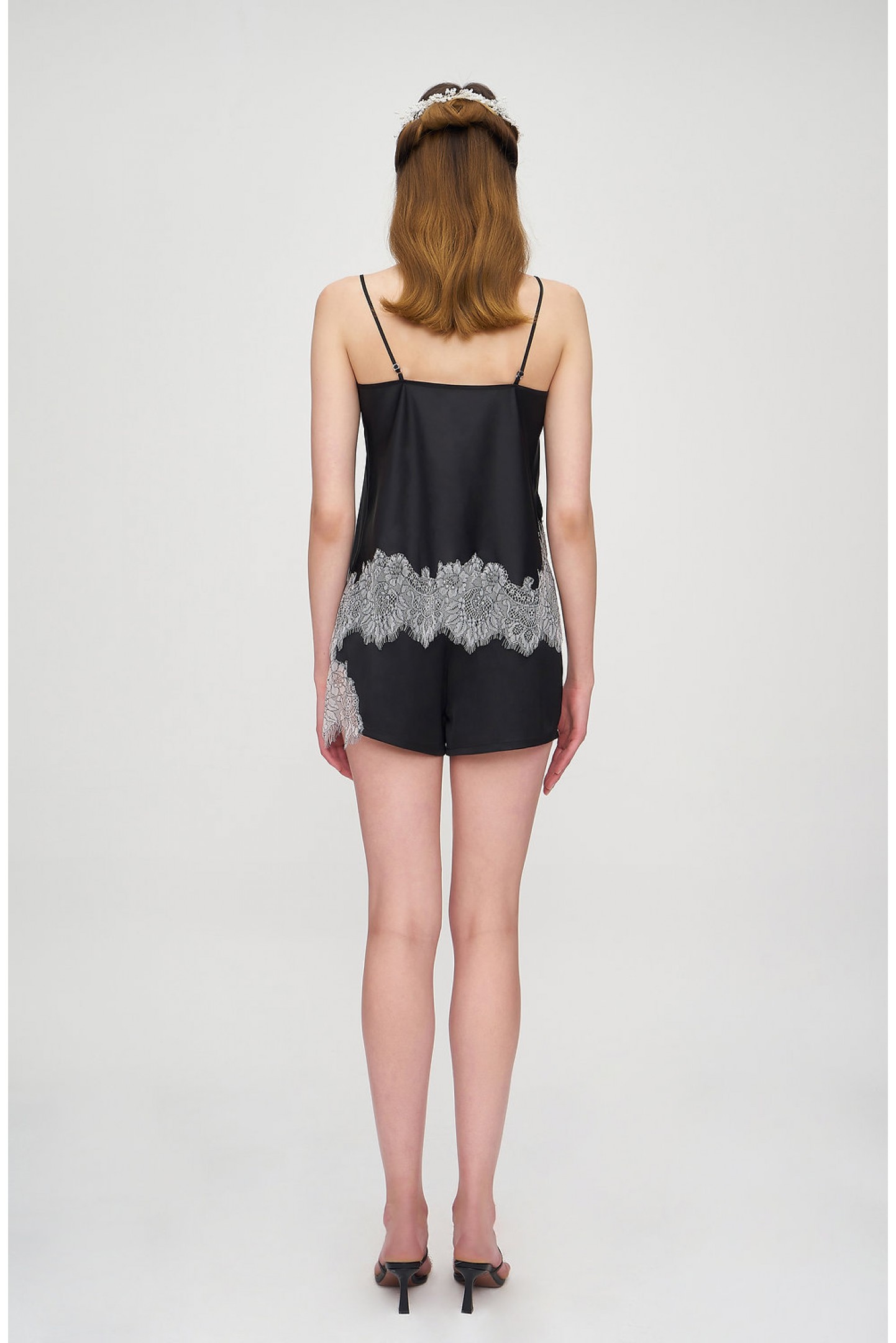 Its relaxed fit, adjustable straps, and delicate lace neckline offer comfort, versatility, and a touch of femininity, while the gently tapered waist and lace-trimmed hem create a flattering silhouette. Whether paired with tailored pants, styled with its matching silk shorts, layered under a blazer, or contrasted with denim, it transitions seamlessly from day to night.